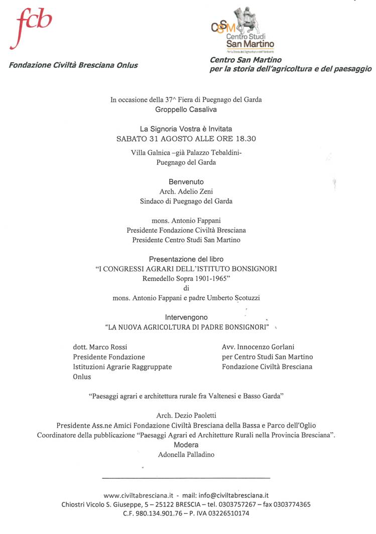 Conferenza: La nuova agricoltura di Padre Bonsignori Presentazione del libro: Paesaggi agrari tra Valtenesi e Basso Garda Invito>> Introduzione>> Mostra>> |