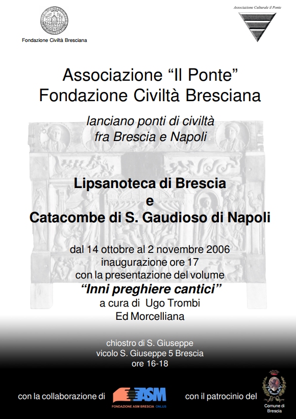 14 ottobre 2006 - Fondazione Civiltà Bresciana Presentazione del volume di Ugo Trombi – “Inni, preghiere, cantici” Copertina>> Invito>> font-style:normal">Interventi dei Proff.Gianenrico Manzoni e Giulio Colombi dell’Editrice Morcelliana. Per l’occasione, con il contributo della Fondazione ASM ed il patrocinio del Comune e della Provincia di Brescia, Presentazione della rassegna didattica Lipsanoteca e Catacombe di S. Gaudioso a Napoli. Mostra-Lipsanoteca>> organizzata dall’Associazione “Il Ponte” e dalla Fondazione Civiltà Bresciana: | ||||