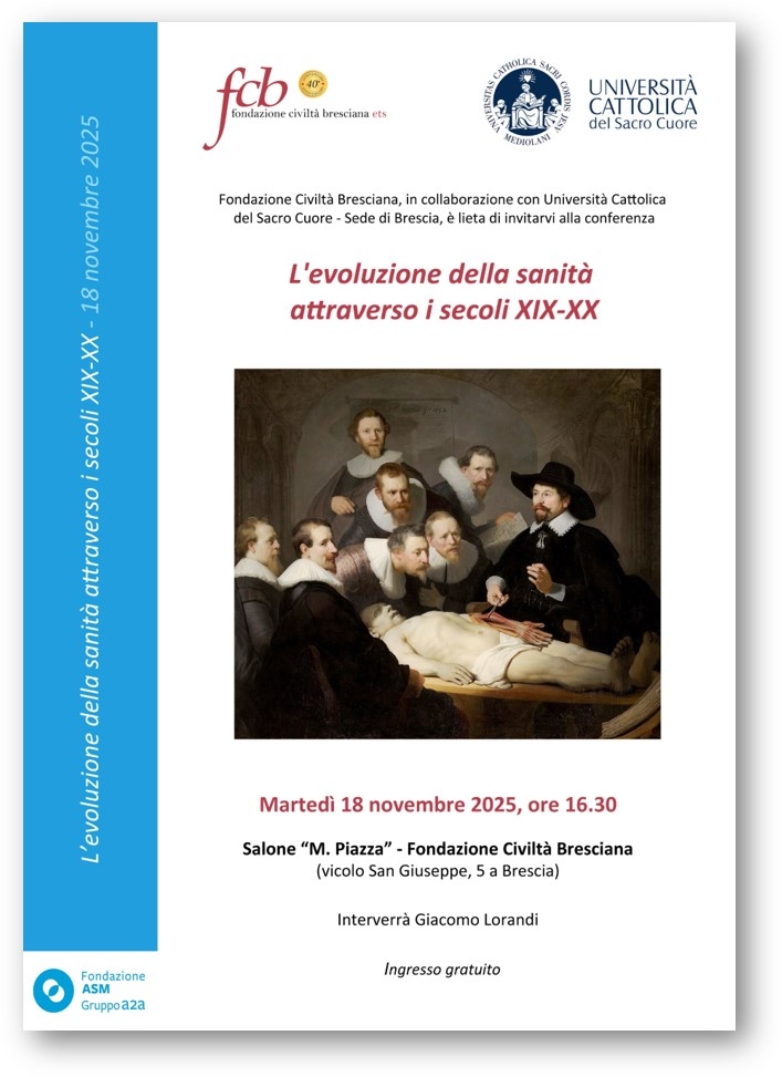 Martedì 18 Novembre 2025, ore 16:30 - Salone Mario Piazza della FCB Conferenza di Giacomo Lorandi: L’evoluzione della sanità attraverso i secoli XIX-XX. La relazione esplora l’evoluzione della medicina tra il XVIII secolo e l’inizio del Novecento, periodo cruciale per la nascita della medicina scientifica. In collaborazione con Università Cattolica del Sacro Cuore – Sede di Brescia. Invito>> | ||