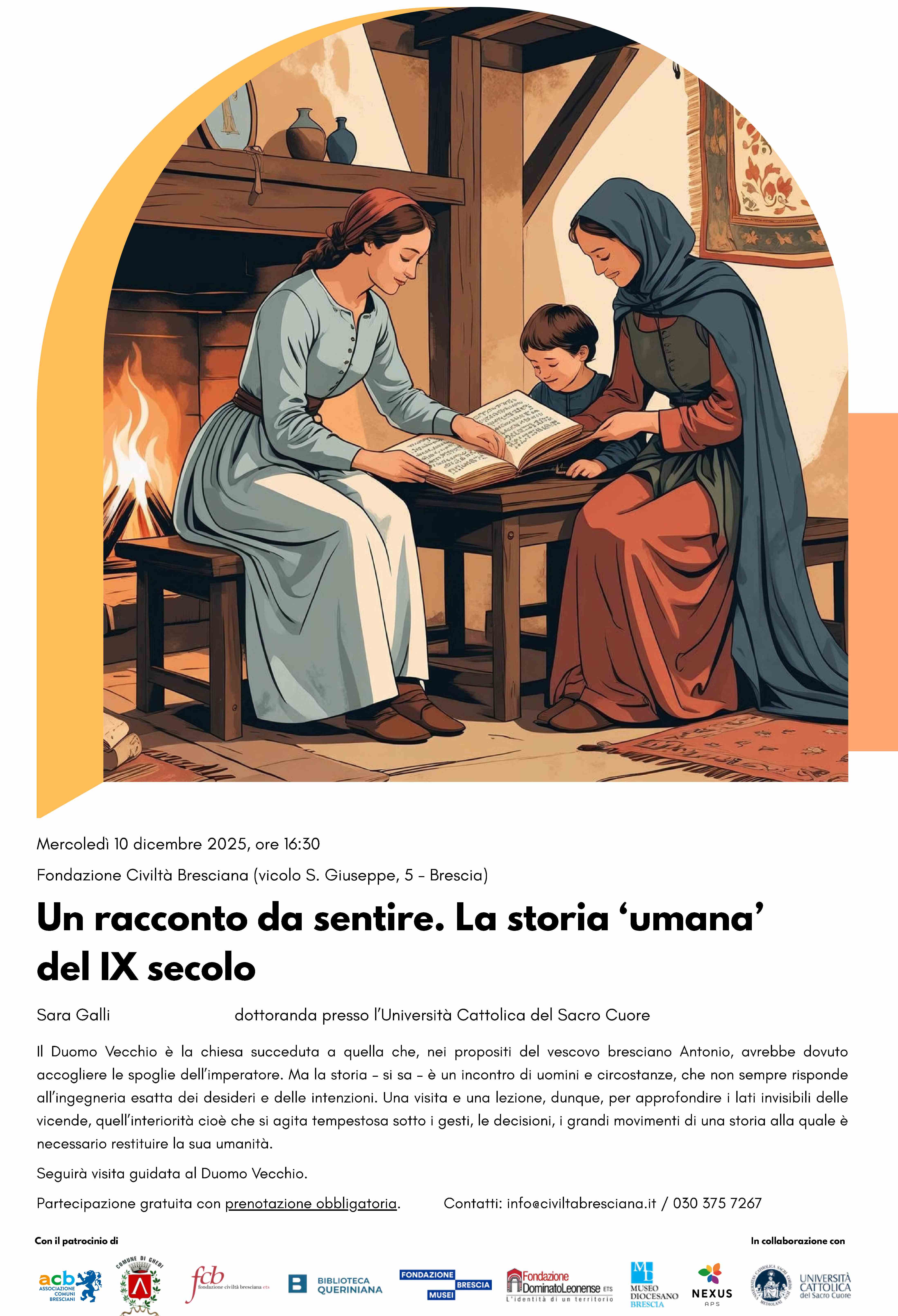 Mercoledì 10 Dicembre 2025, ore 16:30 - Salone Mario Piazza della FCB Conferenza di Sara Galli: Un racconto da sentire. La storia ‘umana’ del IX secolo. Ciclo di Incontri: IL BRESCIANO EPICENTRO DELL’IMPERO - Ludovico II imperatore a 1150 anni dalla morte. Seguirà Visita guidta al Duomo Vecchio di Brescia. Invito>> | ||