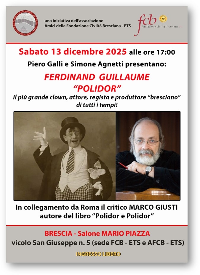 Sabato 13 Dicembre 2025, ore 17 - Salone Mario Piazza della FCB Ferdinand Guillaume “Polidor”: il più grande clown, attore, regista e produttore “bresciano” di tutti i tempi!. Presentazione di Piero Galli e Simone Agnetti. In collegamento da Roma il critico cinematografico Marco Giusti. L’evento è organizzato dall’Associazione Amici della Fondazione Civiltà Bresciana. Invito>> | ||