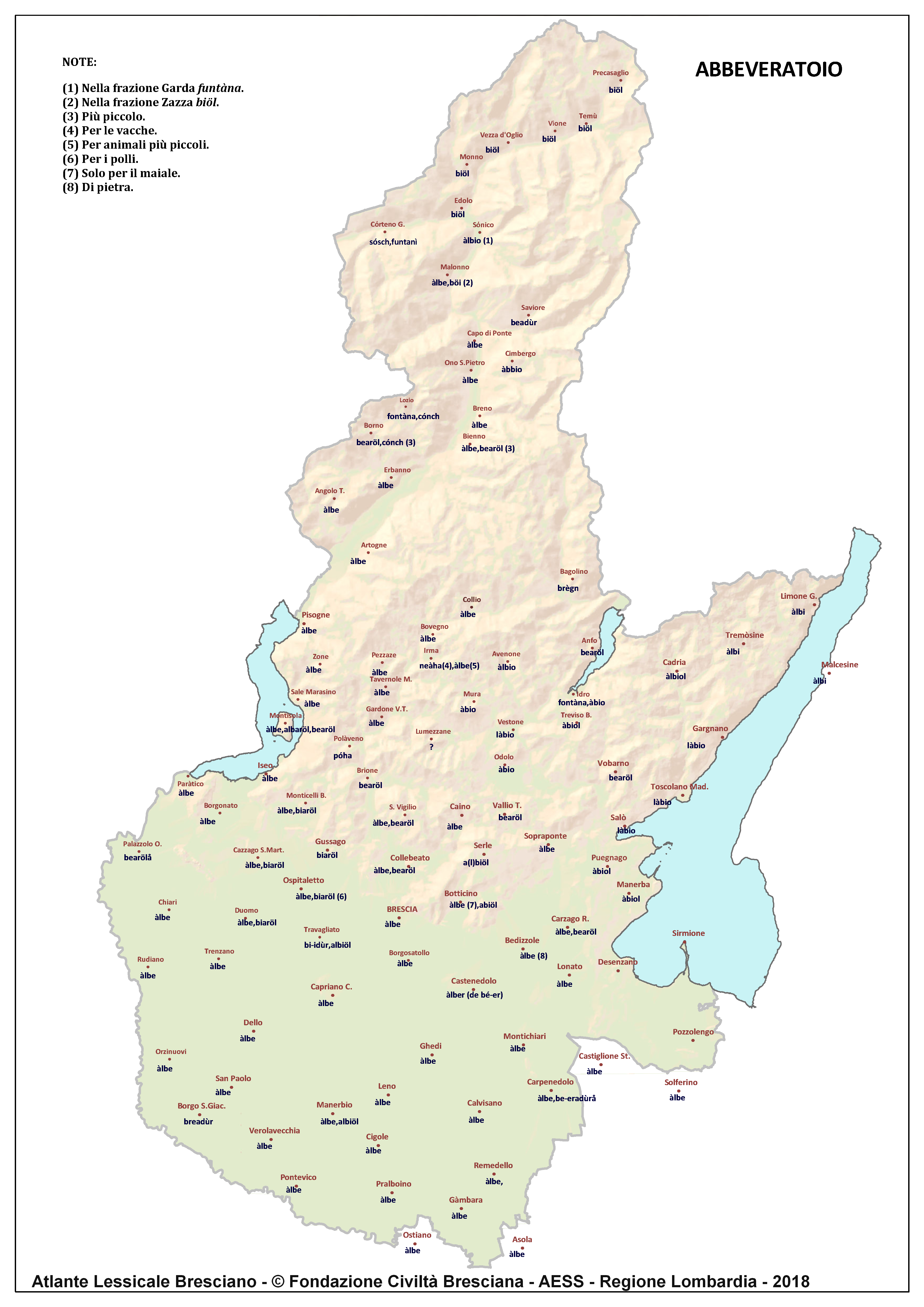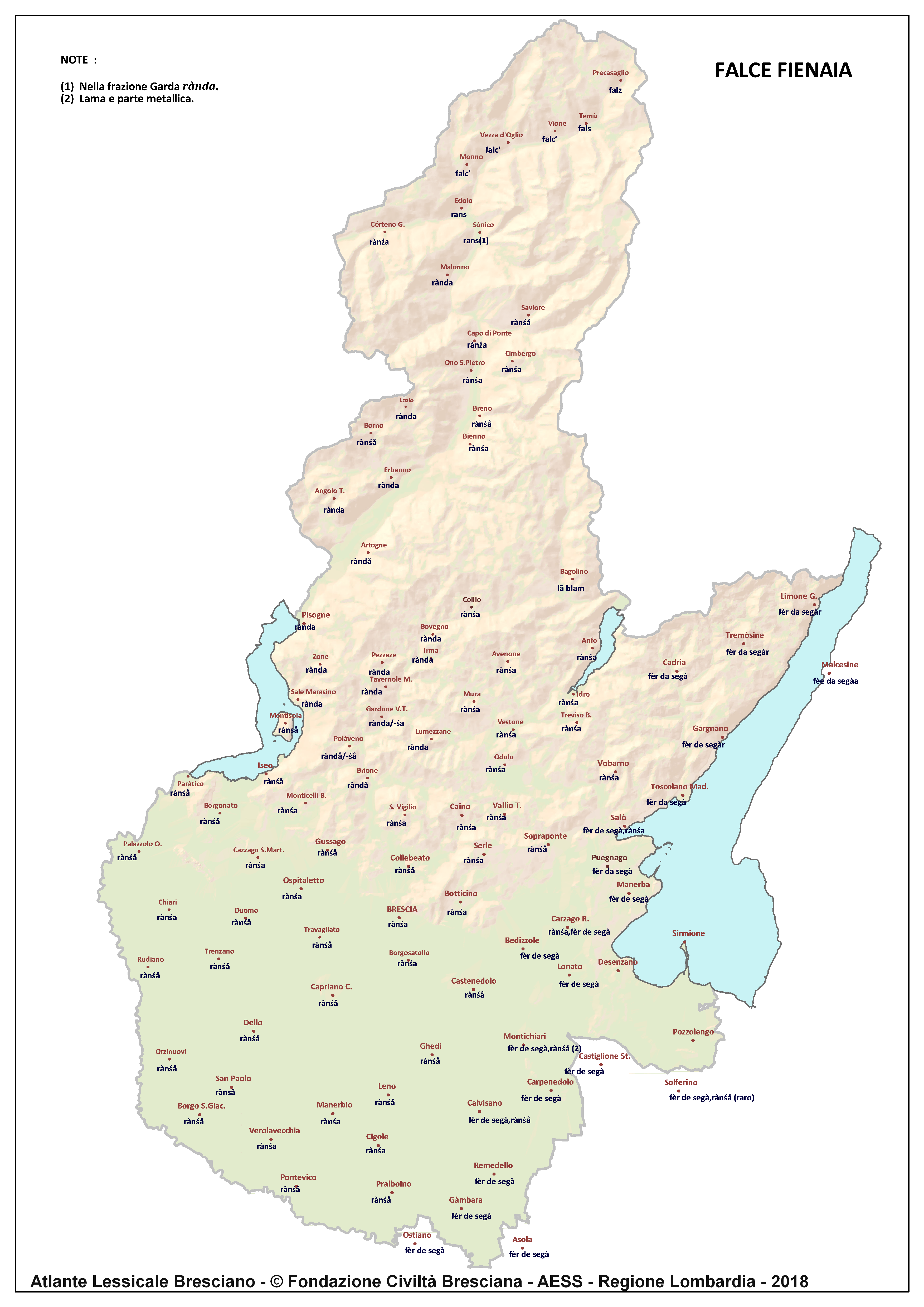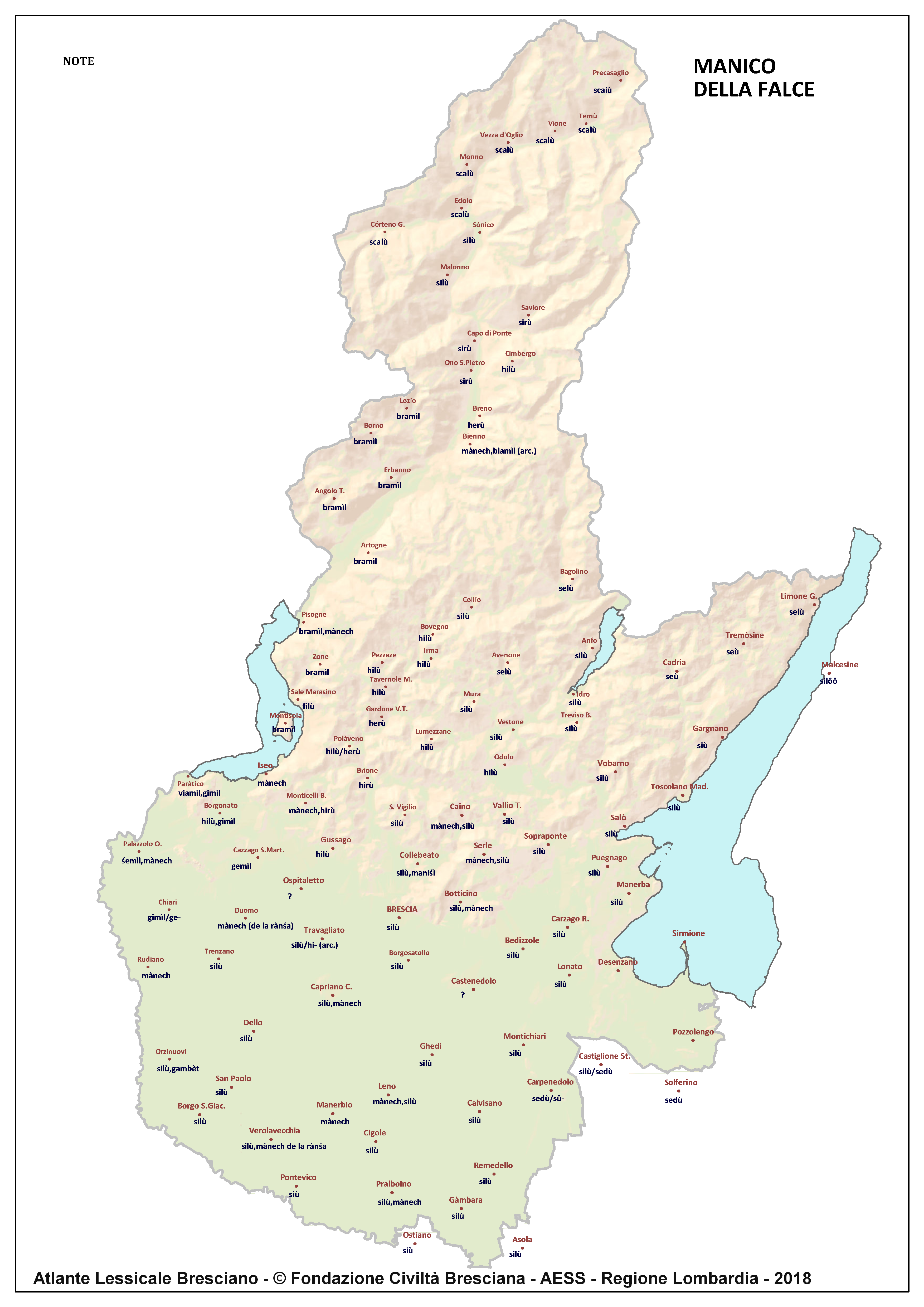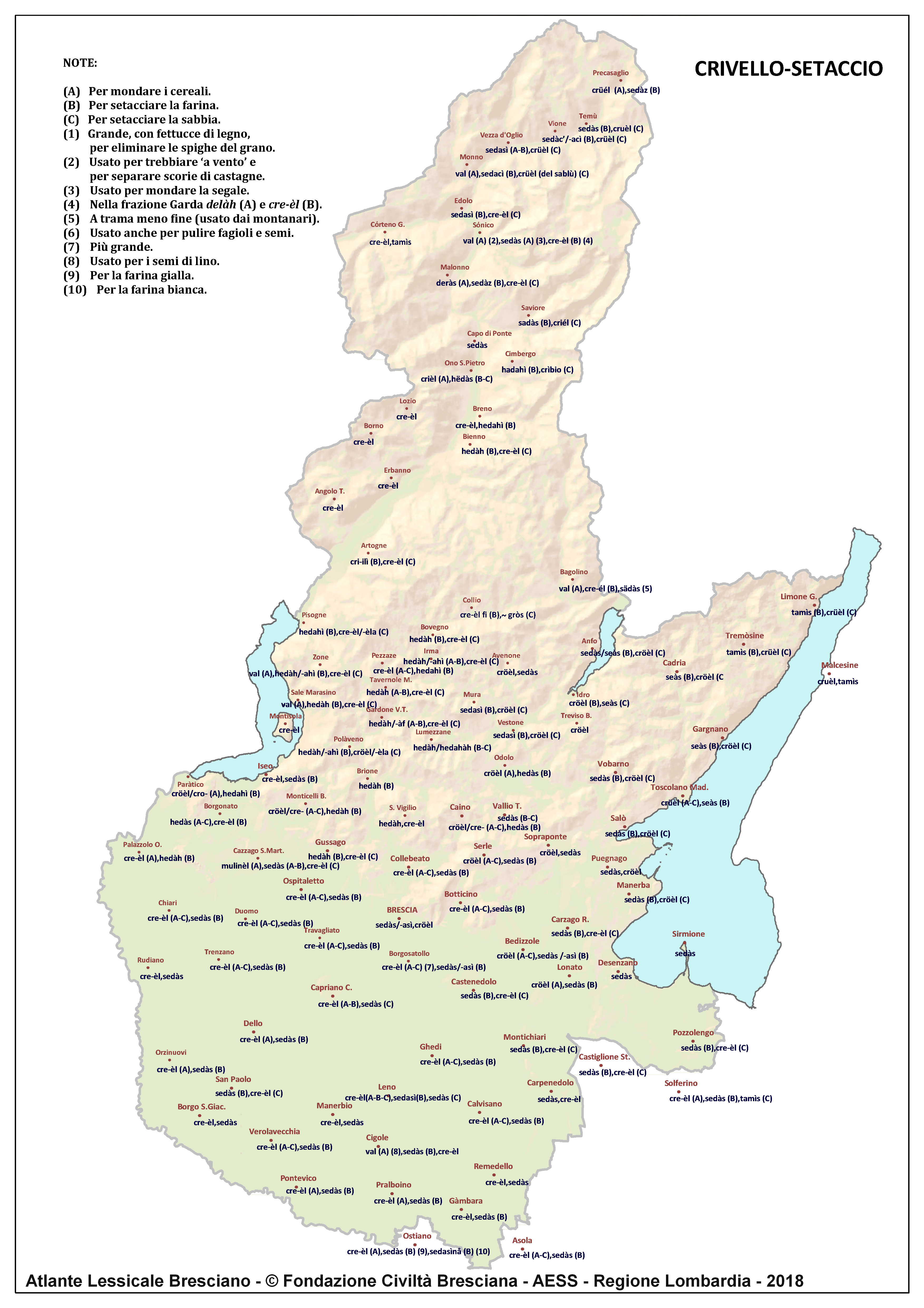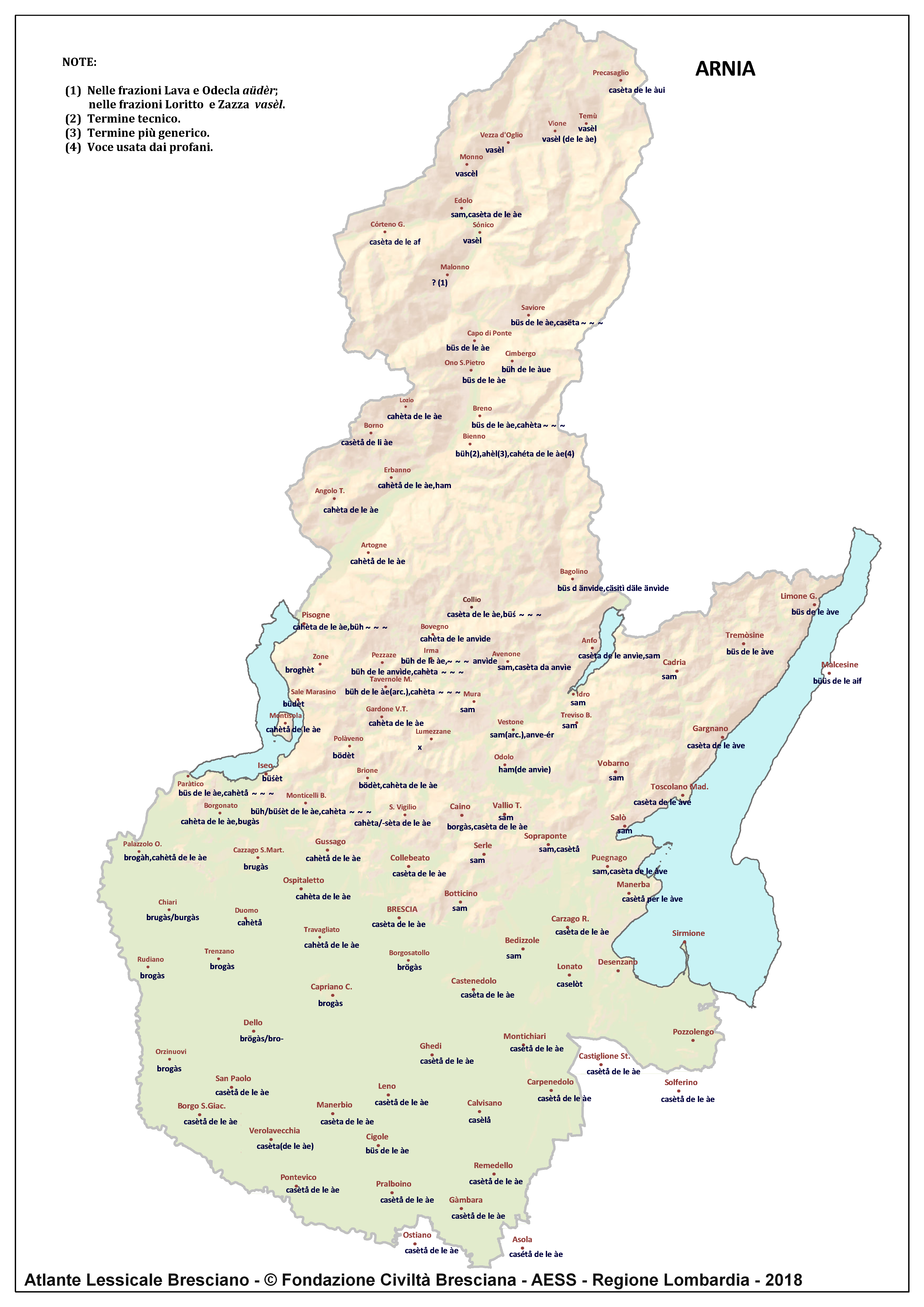 In questa direzione si muove l’Atlante Lessicale Bresciano, che la Fondazione Civiltà Bresciana sta completando sotto la direzione del prof. Giovanni Bonfadini. Presentazione dell’opera. Il dialetto bresciano è parlato in un ampio territorio, fortemente differenziato sia dal punto di vista geografico che da quello socio-economico, con appendici anche al di fuori dei limiti amministrativi provinciali. Sostanzialmente bresciano è infatti il dialetto dell’Alto Mantovano, così come affini al bresciano sono alcuni dialetti delle confinanti valli trentine e della sponda gardesana orientale. In definitiva, possiamo dire che si parlano dialetti di tipo bresciano in quelle aree che, nel lungo lasso di tempo che va dagli albori degli idiomi neolatini fino all’epoca contemporanea, si sono rivolte a Brescia come principale (se non esclusivo) centro di riferimento economico e culturale, anche se non sempre (e in taluni casi mai) sono state sotto la sua giurisdizione amministrativa. In un territorio così vasto le differenze linguistiche, nonostante l’indubbia azione livellatrice del modello cittadino, sono ancora abbastanza evidenti e ciò vale non solo per le zone più periferiche (come l’Alta Val Camonica o l’Alto Garda), ma anche per aree più prossime alla città, specialmente se non dislocate lungo le principali vie di comunicazione (tipico, in questo senso, il caso della Val Gobbia). All’interno dei non molti studi sul bresciano, la variazione geografica del dialetto è stata presa in considerazione in tempi recenti e perlopiù dal punto di vista fonetico e morfologico. Si vedano, a questo proposito, i due saggi di G. Bonfadini Il dialetto bresciano: modello cittadino e varietà periferiche (in ‘Rivista Italiana di dialettologia’, 14, 1990) e Il dialetto bresciano alla luce delle ricerche più recenti (in ‘Annali di storia bresciana’,3, 2015). Poco invece è stato fatto finora per il lessico, che, sulla base dei vocabolari dialettali storici, fornisce un’immagine di unitarietà dovuta unicamente al fatto che tali opere sono state in genere compilate facendo riferimento quasi esclusivamente alla parlata del capoluogo e soltanto da pochissimi anni questa tendenza è stata interrotta grazie al corposo Lessico bresciano di Gianni Pasquini (Roccafranca, 2014) che non a caso ha come sottotitolo I diversi significati, le varie sfumature, le pronunce altre e le scritture di una lingua che ha connotato una civiltà. Sulla scorta dei dati ricavabili dalle inchieste degli atlanti linguistici nazionali – l’Atlante Italo-svizzero (AIS) e l’Atlante Linguistico Italiano (ALI) -, che negli anni Venti e Trenta del secolo scorso hanno interessato il territorio bresciano per una ventina di località, si può invece osservare una grande ricchezza di tipi lessicali diversi per numerosi termini, in particolare (ma non solo) nei settori della flora, della fauna, dei mestieri tradizionali e della vita quotidiana. L’Atlante Lessicale Bresciano si propone di iniziare a colmare questa lacuna attraverso un’indagine a maglie abbastanza strette, che copre con 101 punti di rilevazione circa la metà dei comuni della Provincia di Brescia, sconfinando in cinque casi oltre i limiti amministrativi, e precisamente a Malcésine (VR), Ostiano (CR), Solferino, Castiglione delle Stiviere e Asola (MN). A tal fine il territorio è stato suddiviso in sette aree principali: Brescia e dintorni, Pianura, Garda, Valle Sabbia, Valle Trompia, Franciacorta e Sebino, Valle Camonica, ciascuna delle quali a sua volta ripartita in subaree di dimensioni più limitate. Le inchieste sono state condotte sulla base di un Questionario di 305 voci scelte tra quelle che, da un attento spoglio di tutto il materiale disponibile, mostravano la presenza in area bresciana di almeno due tipi lessicali diversi. Accanto agli obiettivi scientifici, il progetto intende perseguire anche un obiettivo culturale di carattere più generale: contribuire alla documentazione e alla conservazione di un patrimonio linguistico essenziale per la memoria storica delle comunità locali, oggi in continuo depauperamento sotto la spinta della progressiva italianizzazione dei dialetti e dell’abbandono nell’uso concreto di interi settori del lessico strettamente connessi con attività ormai (quasi) completamente scomparse, o radicalmente mutate sul piano dei metodi e delle relative tecnologie. La scelta della forma cartografica per la rappresentazione dei dati raccolti, oltre alla garanzia di una metodologia collaudata in più di un secolo di tradizione scientifica, risponde anche all’opportunità di rendere più semplice la fruizione dei risultati agli utenti non specialisti: le differenze e le somiglianze sono di gran lunga più immediate leggendole su una carta che non in un testo descrittivo. Alcuni dati quantitativi. Per ogni punto di rilevazione sono state condotte, in linea di massima, due inchieste con informatori diversi, in parte direttamente dai membri della Redazione scientifica dell’Atlante che ha operato negli anni della raccolta e della catalogazione del materiale (oltre al Direttore della ricerca, Elisa Noli, Gianfranco Pavia, Giovanni Pontoglio e Piervittorio Rossi), ma per la maggior parte da raccoglitori scelti fra ricercatori ed operatori culturali locali (molti gli insegnanti) e anche da volontari disponibili a raccogliere i dati seguendo il modello elaborato dalla Redazione. Questa attività, condotta spesso con grande entusiasmo e consapevolezza degli obiettivi del progetto, ha interessato nel complesso circa 60 raccoglitori e non meno di 250 informatori. Il lavoro di spoglio e schedatura del materiale raccolto in sette anni dal 1994 al 2000, tenuto conto del numero delle voci del questionario, del numero delle inchieste svolte e dei numerosi casi di risposte multiple, ha comportato l’esame di circa 70.000 forme dialettali. L’edizione dell’Atlante. In attesa del completamento dei lavori redazionali, l’Atla