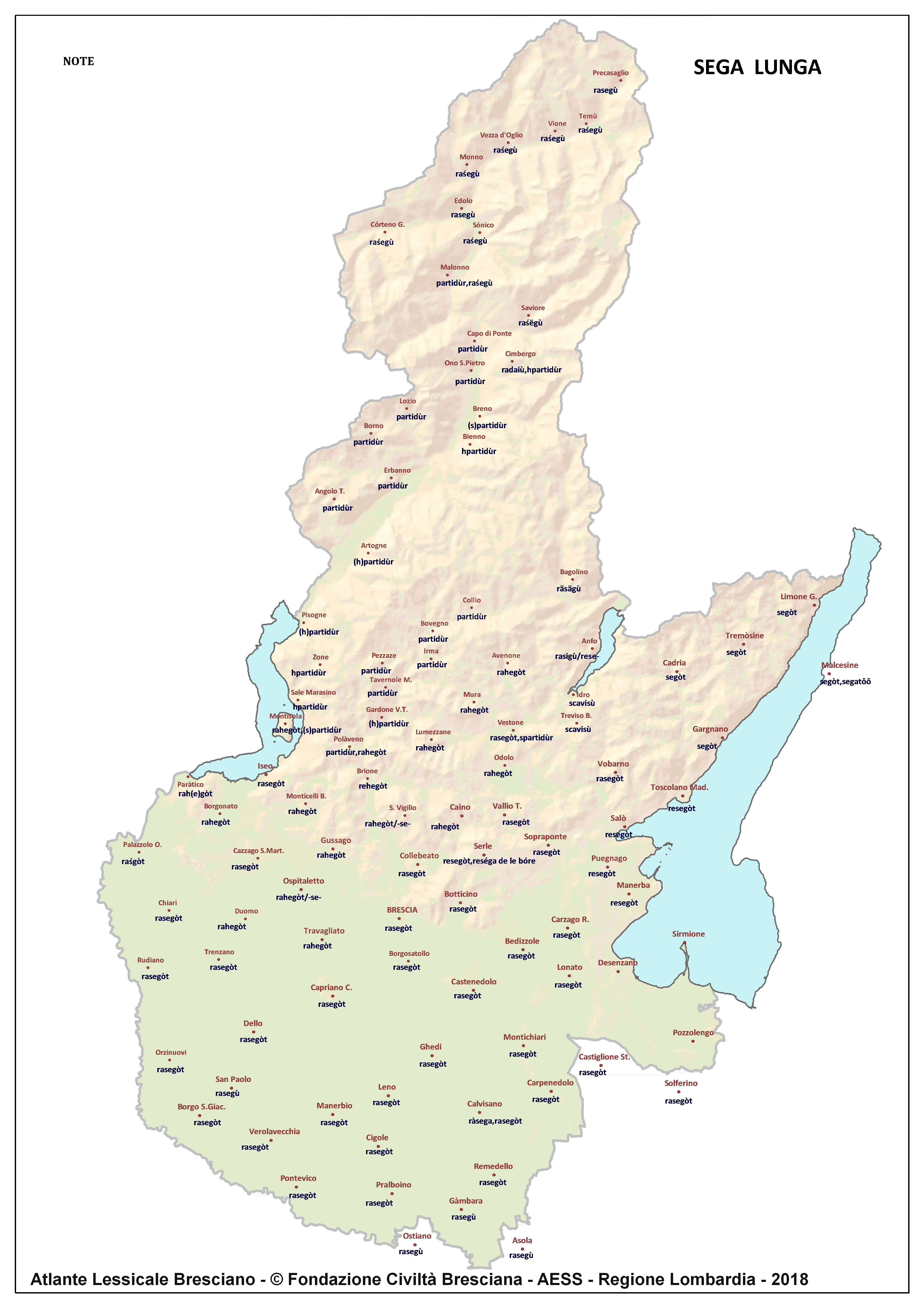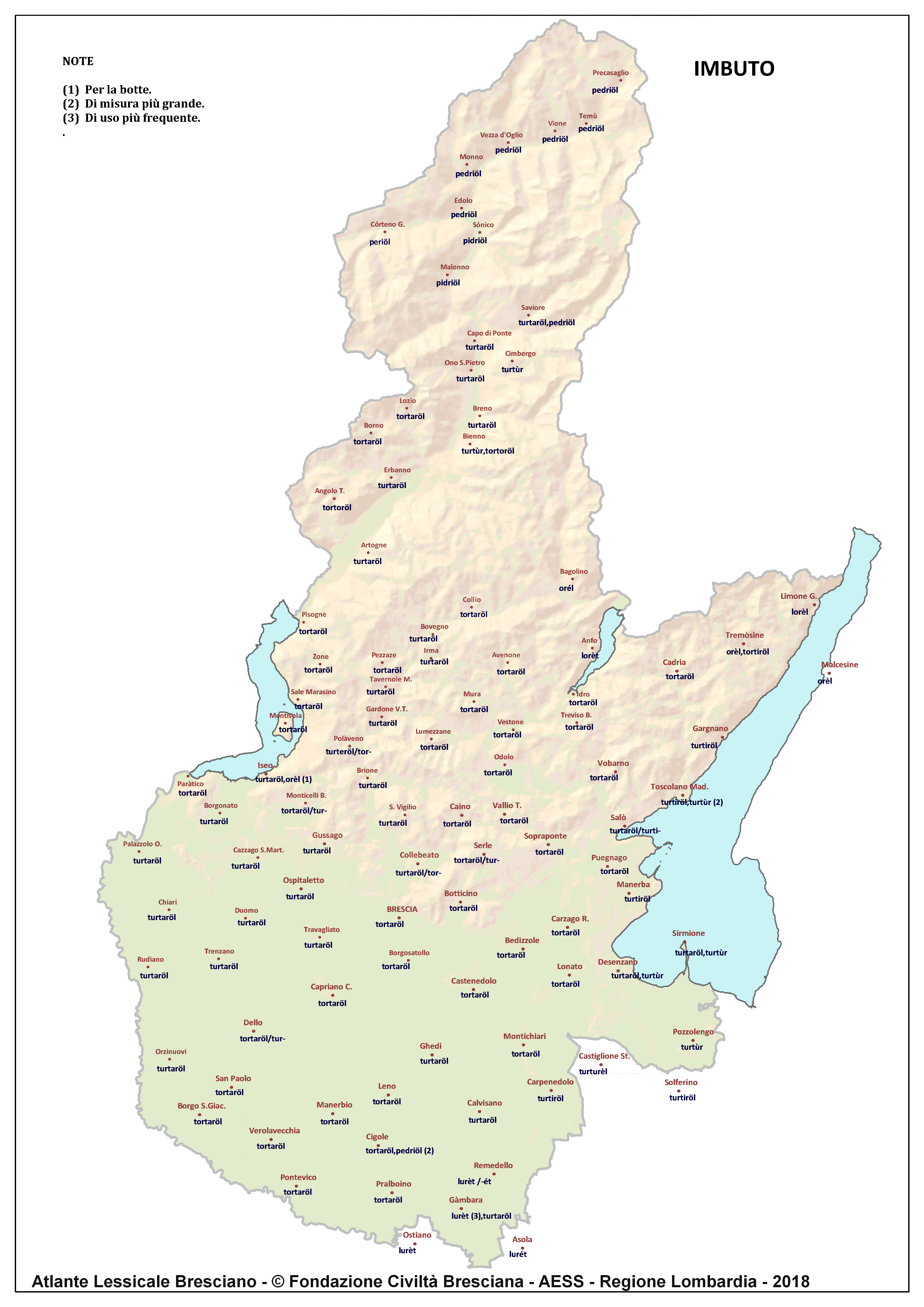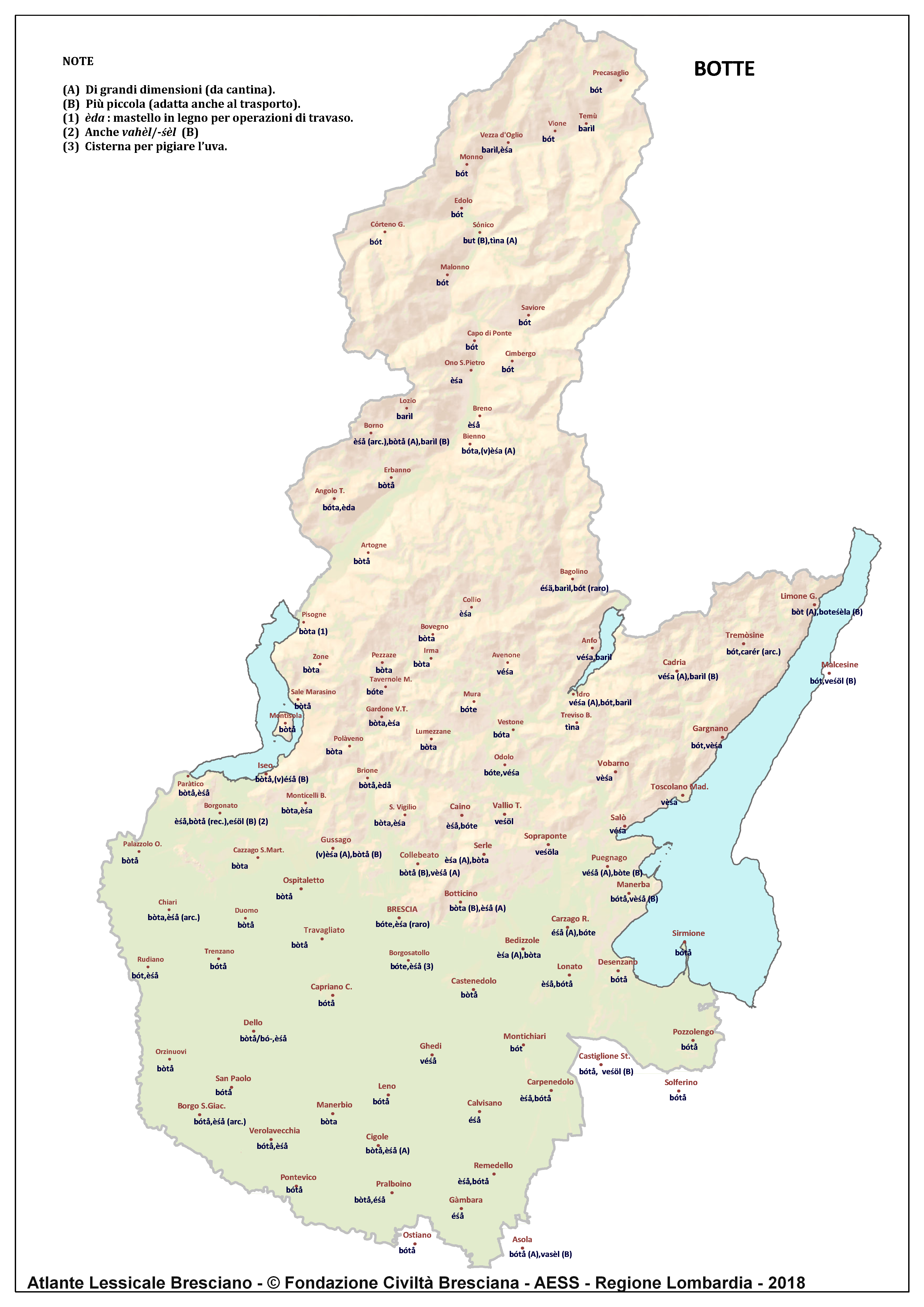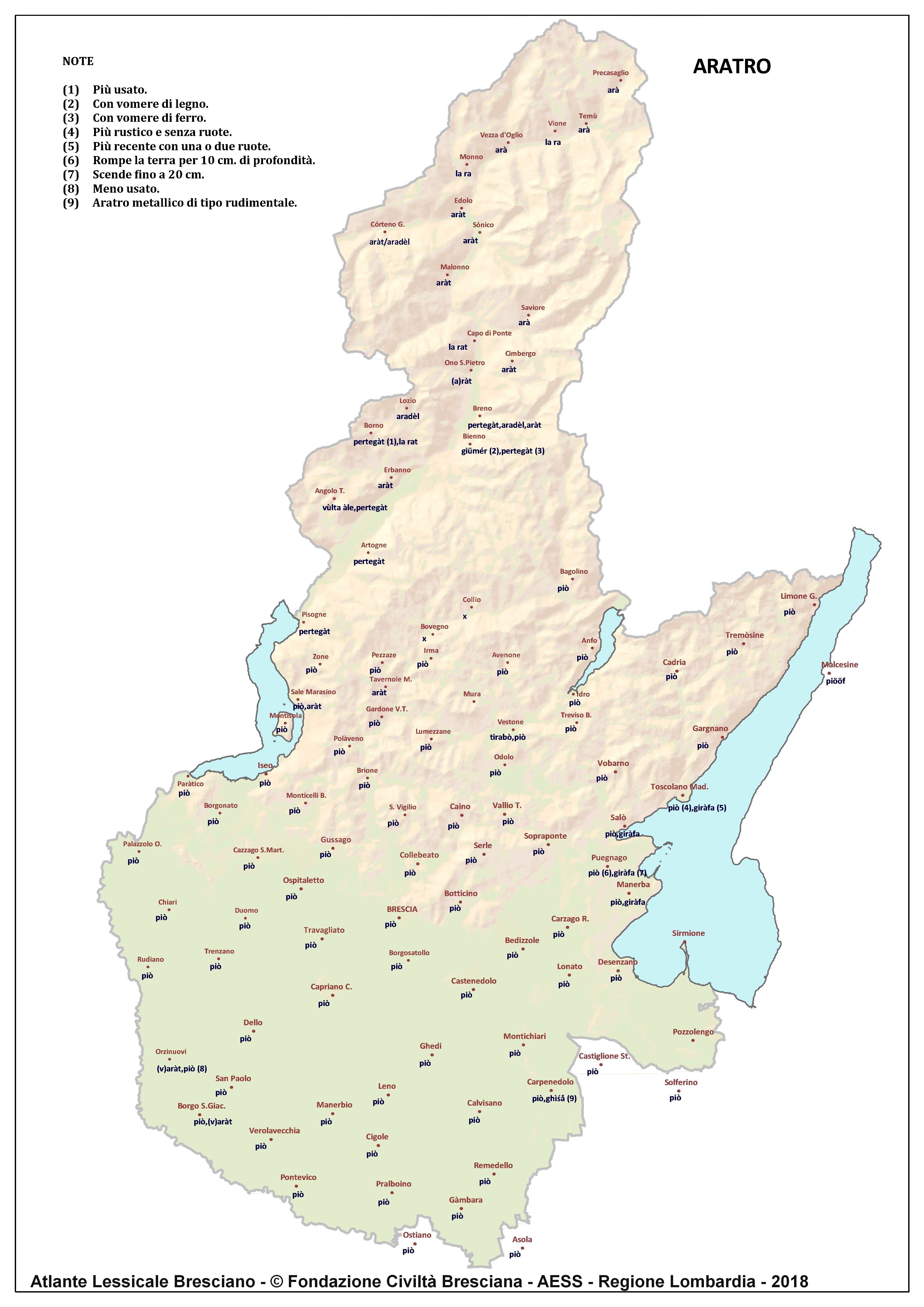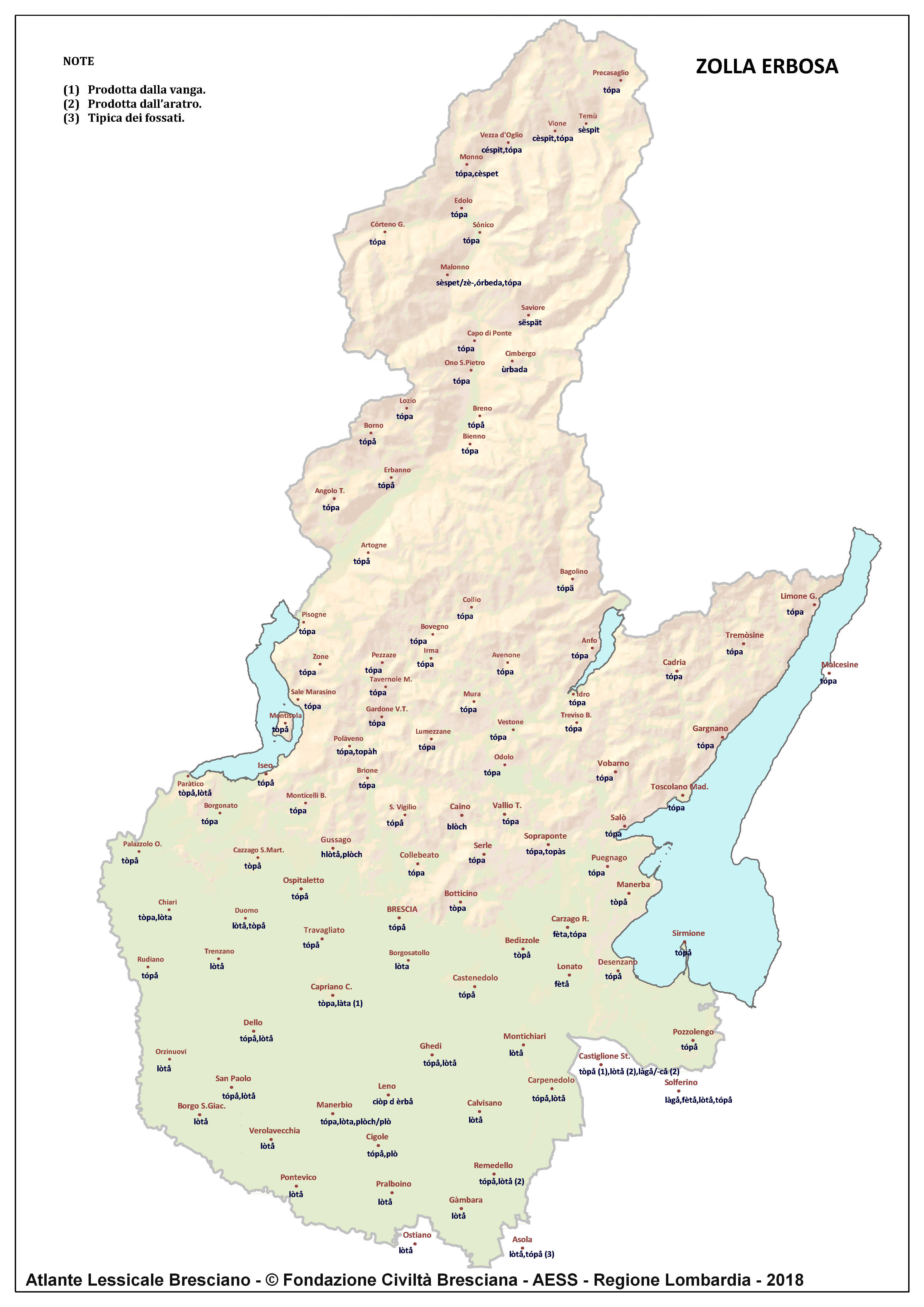 In questa direzione si muove l’Atlante Lessicale Bresciano, che la Fondazione Civiltà Bresciana sta completando sotto la direzione del prof. Giovanni Bonfadini. Presentazione dell’opera. Il dialetto bresciano è parlato in un ampio territorio, fortemente differenziato sia dal punto di vista geografico che da quello socio-economico, con appendici anche al di fuori dei limiti amministrativi provinciali. Sostanzialmente bresciano è infatti il dialetto dell’Alto Mantovano, così come affini al bresciano sono alcuni dialetti delle confinanti valli trentine e della sponda gardesana orientale. In definitiva, possiamo dire che si parlano dialetti di tipo bresciano in quelle aree che, nel lungo lasso di tempo che va dagli albori degli idiomi neolatini fino all’epoca contemporanea, si sono rivolte a Brescia come principale (se non esclusivo) centro di riferimento economico e culturale, anche se non sempre (e in taluni casi mai) sono state sotto la sua giurisdizione amministrativa. In un territorio così vasto le differenze linguistiche, nonostante l’indubbia azione livellatrice del modello cittadino, sono ancora abbastanza evidenti e ciò vale non solo per le zone più periferiche (come l’Alta Val Camonica o l’Alto Garda), ma anche per aree più prossime alla città, specialmente se non dislocate lungo le principali vie di comunicazione (tipico, in questo senso, il caso della Val Gobbia). All’interno dei non molti studi sul bresciano, la variazione geografica del dialetto è stata presa in considerazione in tempi recenti e perlopiù dal punto di vista fonetico e morfologico. Si vedano, a questo proposito, i due saggi di G. Bonfadini Il dialetto bresciano: modello cittadino e varietà periferiche (in ‘Rivista Italiana di dialettologia’, 14, 1990) e Il dialetto bresciano alla luce delle ricerche più recenti (in ‘Annali di storia bresciana’,3, 2015). Poco invece è stato fatto finora per il lessico, che, sulla base dei vocabolari dialettali storici, fornisce un’immagine di unitarietà dovuta unicamente al fatto che tali opere sono state in genere compilate facendo riferimento quasi esclusivamente alla parlata del capoluogo e soltanto da pochissimi anni questa tendenza è stata interrotta grazie al corposo Lessico bresciano di Gianni Pasquini (Roccafranca, 2014) che non a caso ha come sottotitolo I diversi significati, le varie sfumature, le pronunce altre e le scritture di una lingua che ha connotato una civiltà. Sulla scorta dei dati ricavabili dalle inchieste degli atlanti linguistici nazionali – l’Atlante Italo-svizzero (AIS) e l’Atlante Linguistico Italiano (ALI) -, che negli anni Venti e Trenta del secolo scorso hanno interessato il territorio bresciano per una ventina di località, si può invece osservare una grande ricchezza di tipi lessicali diversi per numerosi termini, in particolare (ma non solo) nei settori della flora, della fauna, dei mestieri tradizionali e della vita quotidiana. L’Atlante Lessicale Bresciano si propone di iniziare a colmare questa lacuna attraverso un’indagine a maglie abbastanza strette, che copre con 101 punti di rilevazione circa la metà dei comuni della Provincia di Brescia, sconfinando in cinque casi oltre i limiti amministrativi, e precisamente a Malcésine (VR), Ostiano (CR), Solferino, Castiglione delle Stiviere e Asola (MN). A tal fine il territorio è stato suddiviso in sette aree principali: Brescia e dintorni, Pianura, Garda, Valle Sabbia, Valle Trompia, Franciacorta e Sebino, Valle Camonica, ciascuna delle quali a sua volta ripartita in subaree di dimensioni più limitate. Le inchieste sono state condotte sulla base di un Questionario di 305 voci scelte tra quelle che, da un attento spoglio di tutto il materiale disponibile, mostravano la presenza in area bresciana di almeno due tipi lessicali diversi. Accanto agli obiettivi scientifici, il progetto intende perseguire anche un obiettivo culturale di carattere più generale: contribuire alla documentazione e alla conservazione di un patrimonio linguistico essenziale per la memoria storica delle comunità locali, oggi in continuo depauperamento sotto la spinta della progressiva italianizzazione dei dialetti e dell’abbandono nell’uso concreto di interi settori del lessico strettamente connessi con attività ormai (quasi) completamente scomparse, o radicalmente mutate sul piano dei metodi e delle relative tecnologie. La scelta della forma cartografica per la rappresentazione dei dati raccolti, oltre alla garanzia di una metodologia collaudata in più di un secolo di tradizione scientifica, risponde anche all’opportunità di rendere più semplice la fruizione dei risultati agli utenti non specialisti: le differenze e le somiglianze sono di gran lunga più immediate leggendole su una carta che non in un testo descrittivo. Alcuni dati quantitativi. Per ogni punto di rilevazione sono state condotte, in linea di massima, due inchieste con informatori diversi, in parte direttamente dai membri della Redazione scientifica dell’Atlante che ha operato negli anni della raccolta e della catalogazione del materiale (oltre al Direttore della ricerca, Elisa Noli, Gianfranco Pavia, Giovanni Pontoglio e Piervittorio Rossi), ma per la maggior parte da raccoglitori scelti fra ricercatori ed operatori culturali locali (molti gli insegnanti) e anche da volontari disponibili a raccogliere i dati seguendo il modello elaborato dalla Redazione. Questa attività, condotta spesso con grande entusiasmo e consapevolezza degli obiettivi del progetto, ha interessato nel complesso circa 60 raccoglitori e non meno di 250 informatori. Il lavoro di spoglio e schedatura del materiale raccolto in sette anni dal 1994 al 2000, tenuto conto del numero delle voci del questionario, del numero delle inchieste svolte e dei numerosi casi di risposte multiple, ha comportato l’esame di circa 70.000 forme dialettali. L’edizione dell’Atlante. In attesa del completamento dei lavori redazionali, l’Atla
