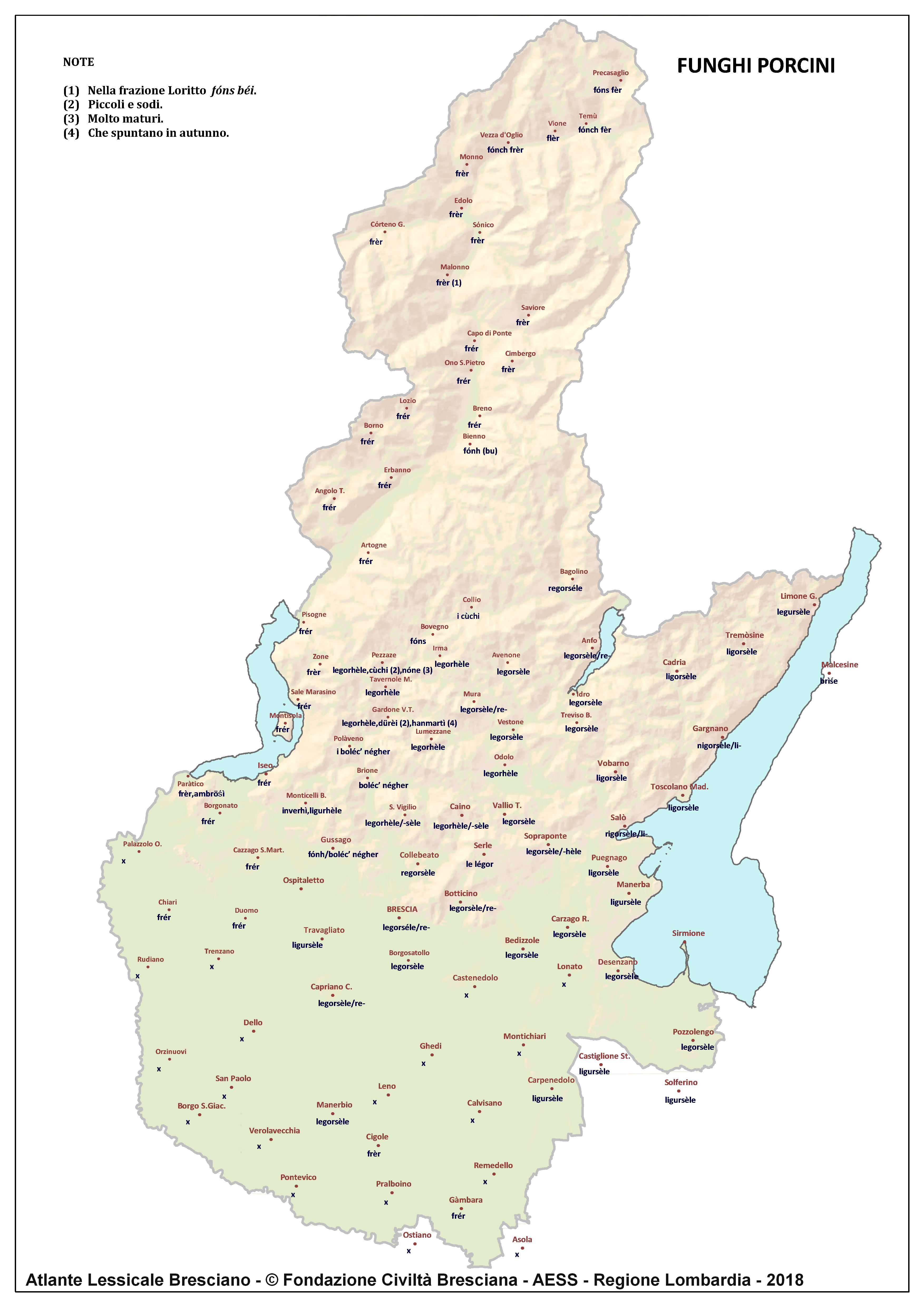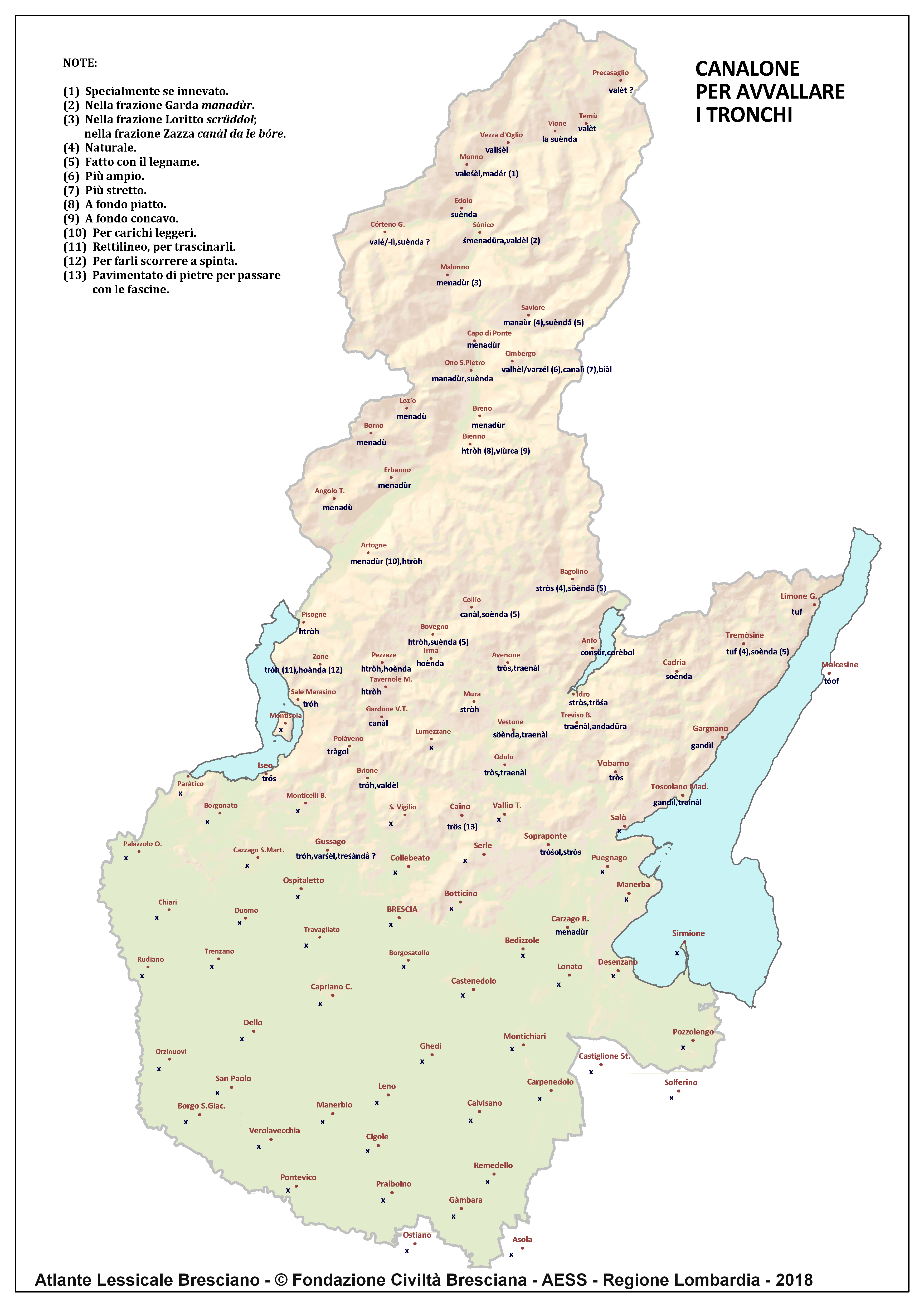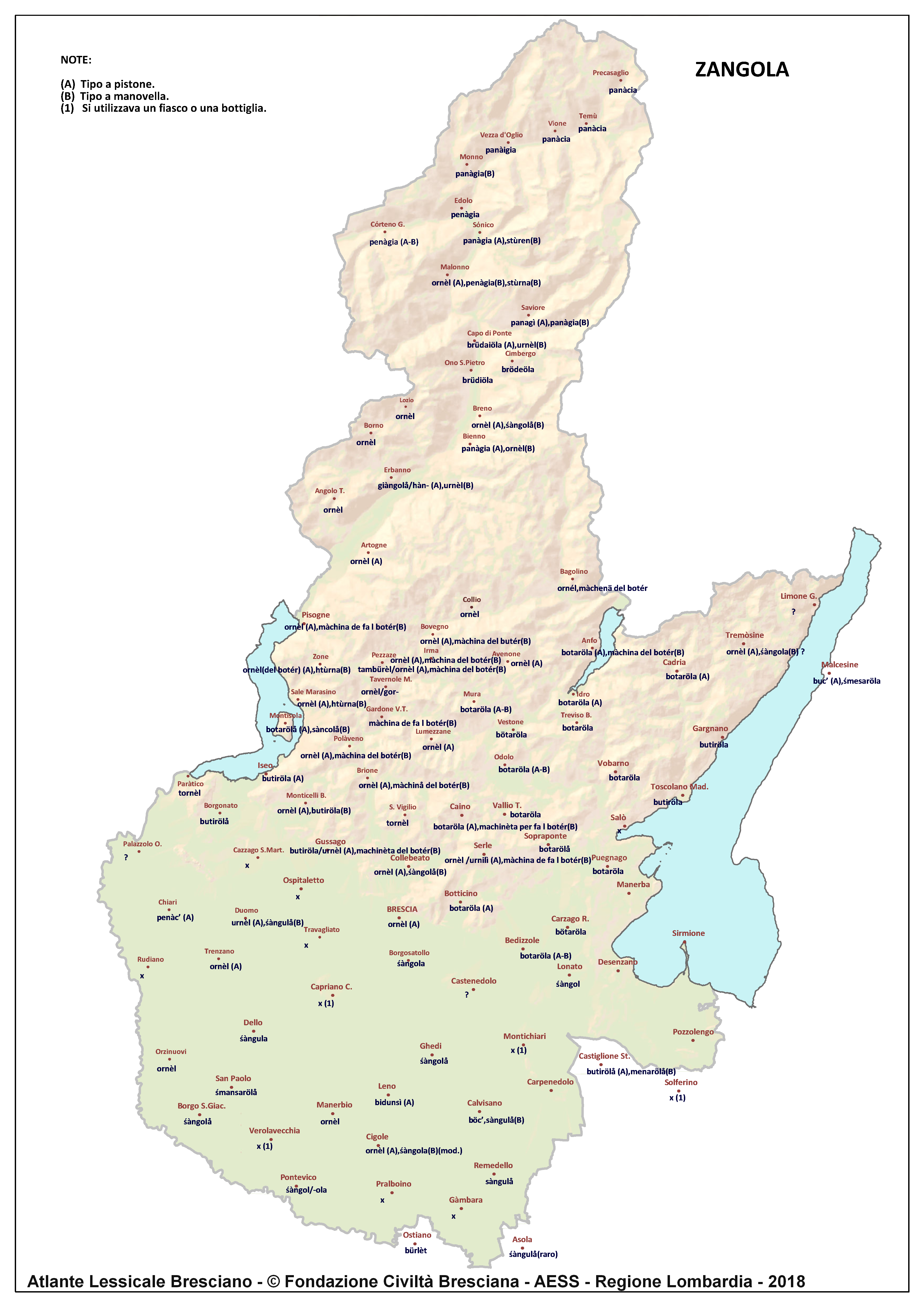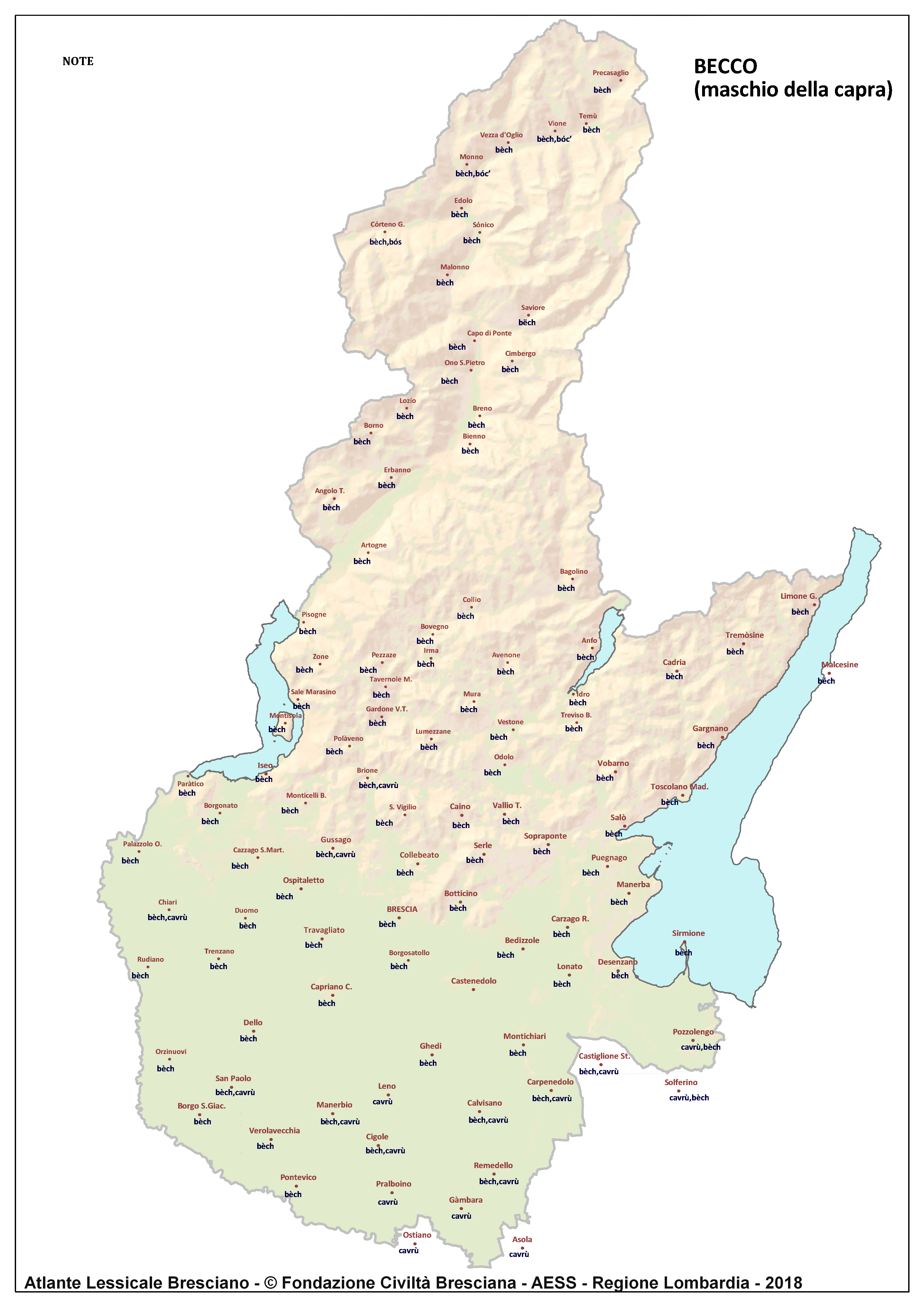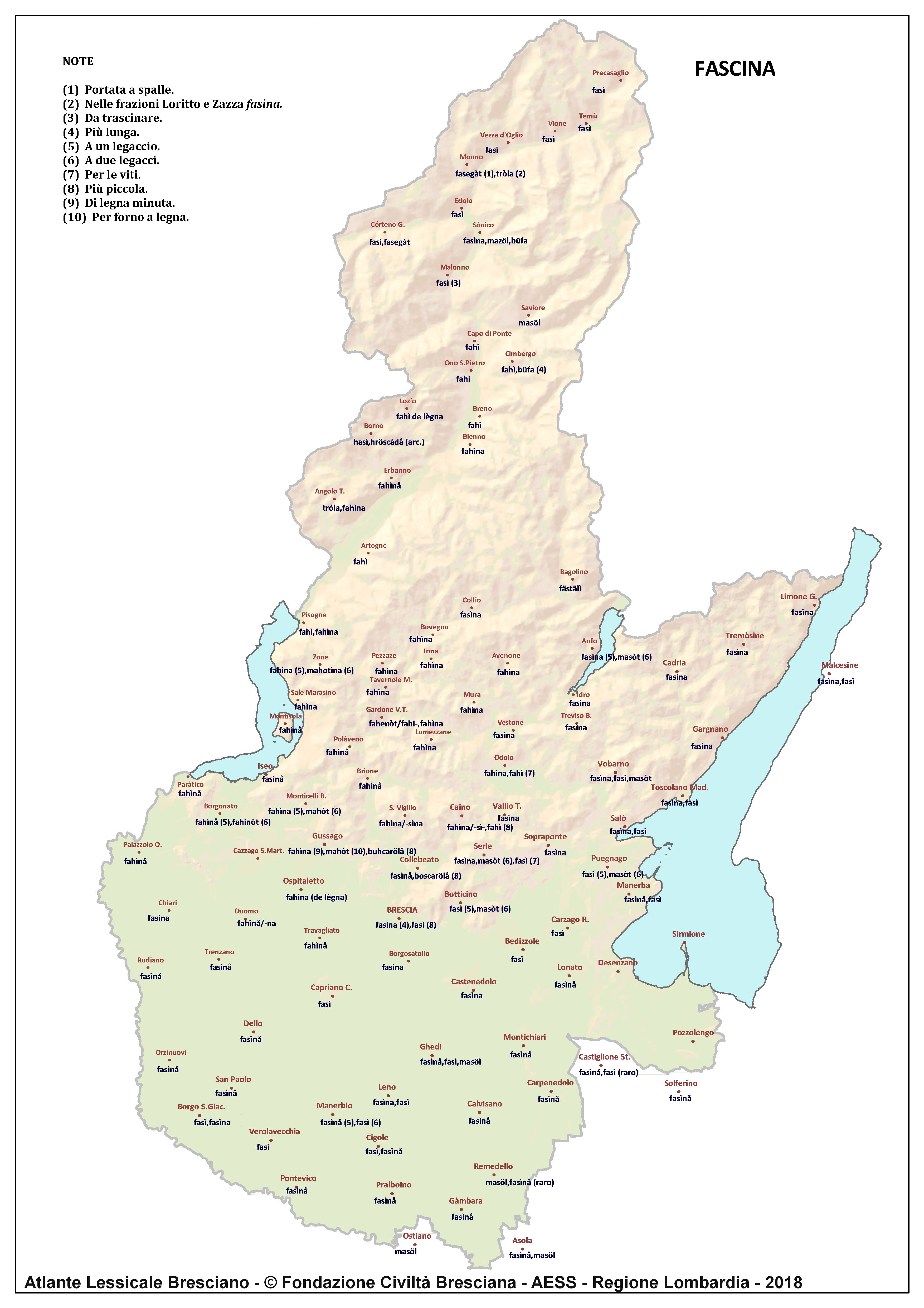 In questa direzione si muove l’Atlante Lessicale Bresciano, che la Fondazione Civiltà Bresciana sta completando sotto la direzione del prof. Giovanni Bonfadini. Presentazione dell’opera. Il dialetto bresciano è parlato in un ampio territorio, fortemente differenziato sia dal punto di vista geografico che da quello socio-economico, con appendici anche al di fuori dei limiti amministrativi provinciali. Sostanzialmente bresciano è infatti il dialetto dell’Alto Mantovano, così come affini al bresciano sono alcuni dialetti delle confinanti valli trentine e della sponda gardesana orientale. In definitiva, possiamo dire che si parlano dialetti di tipo bresciano in quelle aree che, nel lungo lasso di tempo che va dagli albori degli idiomi neolatini fino all’epoca contemporanea, si sono rivolte a Brescia come principale (se non esclusivo) centro di riferimento economico e culturale, anche se non sempre (e in taluni casi mai) sono state sotto la sua giurisdizione amministrativa. In un territorio così vasto le differenze linguistiche, nonostante l’indubbia azione livellatrice del modello cittadino, sono ancora abbastanza evidenti e ciò vale non solo per le zone più periferiche (come l’Alta Val Camonica o l’Alto Garda), ma anche per aree più prossime alla città, specialmente se non dislocate lungo le principali vie di comunicazione (tipico, in questo senso, il caso della Val Gobbia). All’interno dei non molti studi sul bresciano, la variazione geografica del dialetto è stata presa in considerazione in tempi recenti e perlopiù dal punto di vista fonetico e morfologico. Si vedano, a questo proposito, i due saggi di G. Bonfadini Il dialetto bresciano: modello cittadino e varietà periferiche (in ‘Rivista Italiana di dialettologia’, 14, 1990) e Il dialetto bresciano alla luce delle ricerche più recenti (in ‘Annali di storia bresciana’,3, 2015). Poco invece è stato fatto finora per il lessico, che, sulla base dei vocabolari dialettali storici, fornisce un’immagine di unitarietà dovuta unicamente al fatto che tali opere sono state in genere compilate facendo riferimento quasi esclusivamente alla parlata del capoluogo e soltanto da pochissimi anni questa tendenza è stata interrotta grazie al corposo Lessico bresciano di Gianni Pasquini (Roccafranca, 2014) che non a caso ha come sottotitolo I diversi significati, le varie sfumature, le pronunce altre e le scritture di una lingua che ha connotato una civiltà. Sulla scorta dei dati ricavabili dalle inchieste degli atlanti linguistici nazionali – l’Atlante Italo-svizzero (AIS) e l’Atlante Linguistico Italiano (ALI) -, che negli anni Venti e Trenta del secolo scorso hanno interessato il territorio bresciano per una ventina di località, si può invece osservare una grande ricchezza di tipi lessicali diversi per numerosi termini, in particolare (ma non solo) nei settori della flora, della fauna, dei mestieri tradizionali e della vita quotidiana. L’Atlante Lessicale Bresciano si propone di iniziare a colmare questa lacuna attraverso un’indagine a maglie abbastanza strette, che copre con 101 punti di rilevazione circa la metà dei comuni della Provincia di Brescia, sconfinando in cinque casi oltre i limiti amministrativi, e precisamente a Malcésine (VR), Ostiano (CR), Solferino, Castiglione delle Stiviere e Asola (MN). A tal fine il territorio è stato suddiviso in sette aree principali: Brescia e dintorni, Pianura, Garda, Valle Sabbia, Valle Trompia, Franciacorta e Sebino, Valle Camonica, ciascuna delle quali a sua volta ripartita in subaree di dimensioni più limitate. Le inchieste sono state condotte sulla base di un Questionario di 305 voci scelte tra quelle che, da un attento spoglio di tutto il materiale disponibile, mostravano la presenza in area bresciana di almeno due tipi lessicali diversi. Accanto agli obiettivi scientifici, il progetto intende perseguire anche un obiettivo culturale di carattere più generale: contribuire alla documentazione e alla conservazione di un patrimonio linguistico essenziale per la memoria storica delle comunità locali, oggi in continuo depauperamento sotto la spinta della progressiva italianizzazione dei dialetti e dell’abbandono nell’uso concreto di interi settori del lessico strettamente connessi con attività ormai (quasi) completamente scomparse, o radicalmente mutate sul piano dei metodi e delle relative tecnologie. La scelta della forma cartografica per la rappresentazione dei dati raccolti, oltre alla garanzia di una metodologia collaudata in più di un secolo di tradizione scientifica, risponde anche all’opportunità di rendere più semplice la fruizione dei risultati agli utenti non specialisti: le differenze e le somiglianze sono di gran lunga più immediate leggendole su una carta che non in un testo descrittivo. Alcuni dati quantitativi. Per ogni punto di rilevazione sono state condotte, in linea di massima, due inchieste con informatori diversi, in parte direttamente dai membri della Redazione scientifica dell’Atlante che ha operato negli anni della raccolta e della catalogazione del materiale (oltre al Direttore della ricerca, Elisa Noli, Gianfranco Pavia, Giovanni Pontoglio e Piervittorio Rossi), ma per la maggior parte da raccoglitori scelti fra ricercatori ed operatori culturali locali (molti gli insegnanti) e anche da volontari disponibili a raccogliere i dati seguendo il modello elaborato dalla Redazione. Questa attività, condotta spesso con grande entusiasmo e consapevolezza degli obiettivi del progetto, ha interessato nel complesso circa 60 raccoglitori e non meno di 250 informatori. Il lavoro di spoglio e schedatura del materiale raccolto in sette anni dal 1994 al 2000, tenuto conto del numero delle voci del questionario, del numero delle inchieste svolte e dei numerosi casi di risposte multiple, ha comportato l’esame di circa 70.000 forme dialettali. L’edizione dell’Atlante. In attesa del completamento dei lavori redazionali, l’Atla