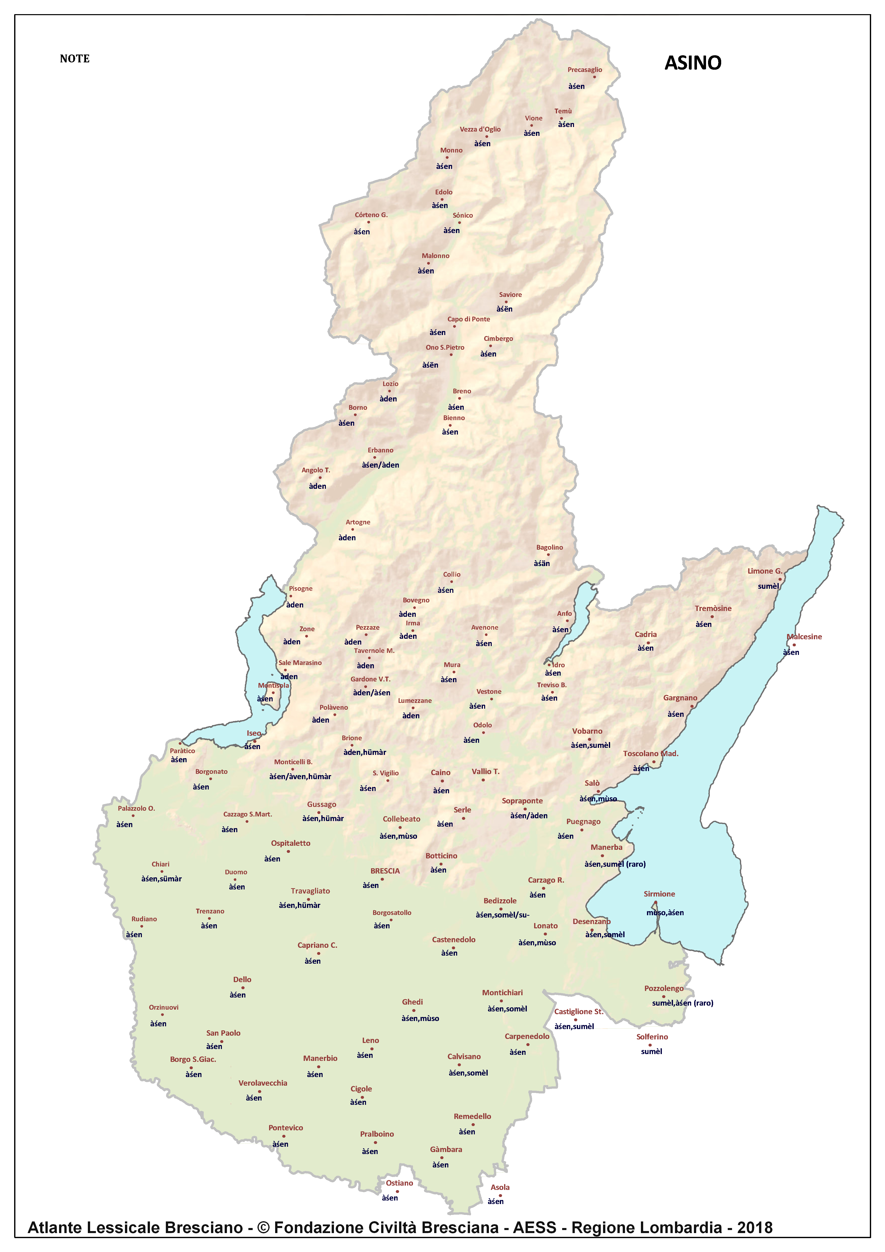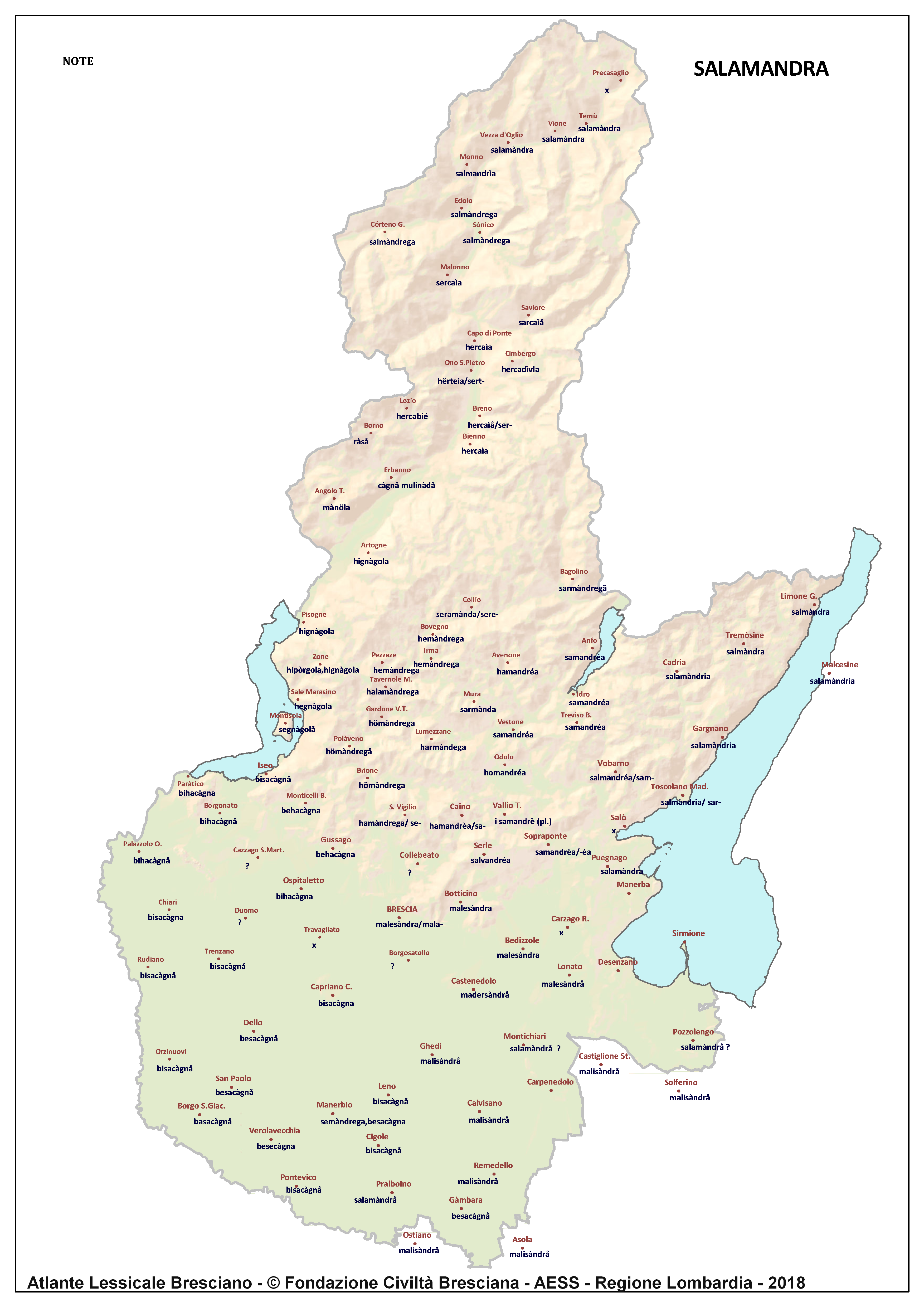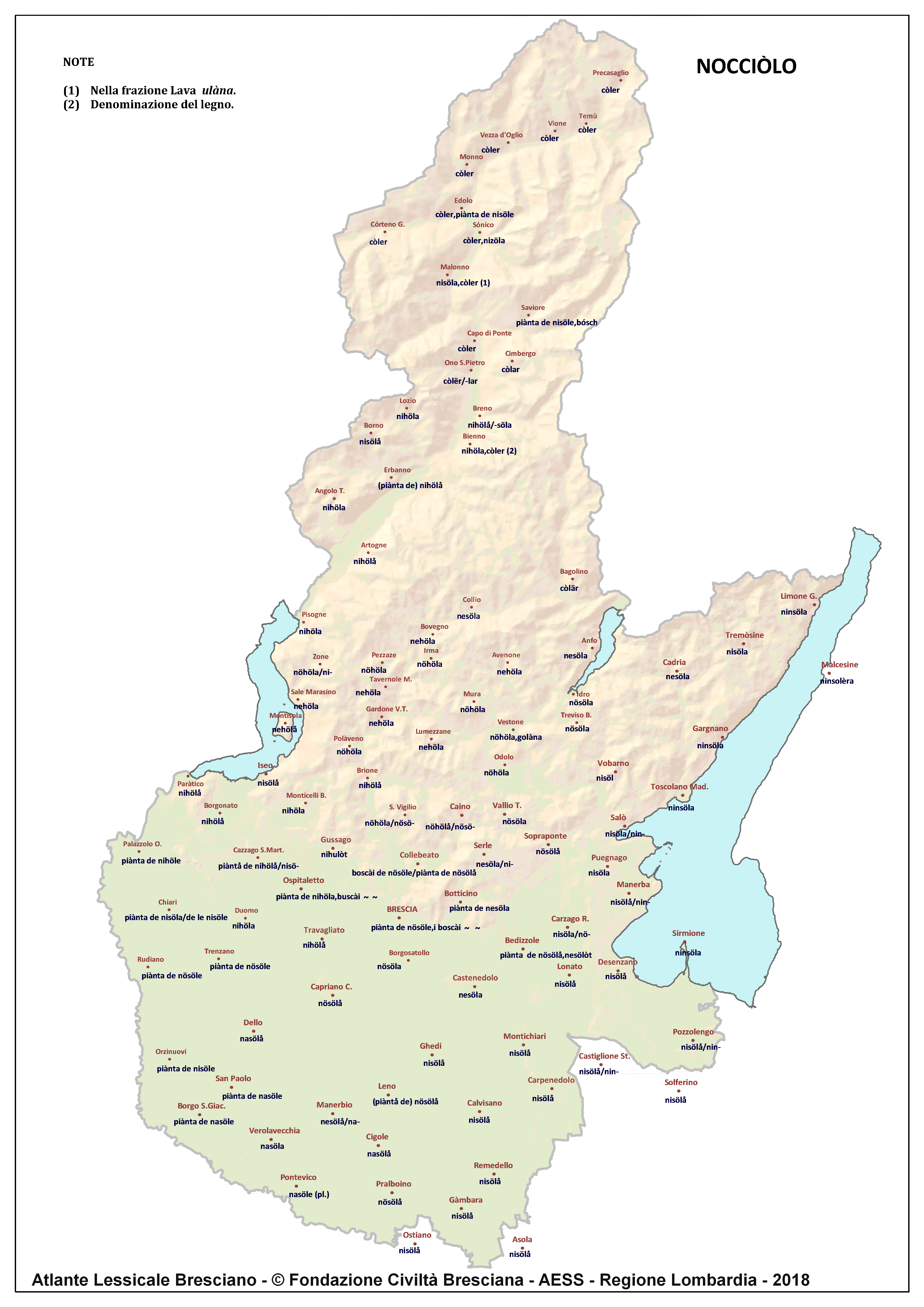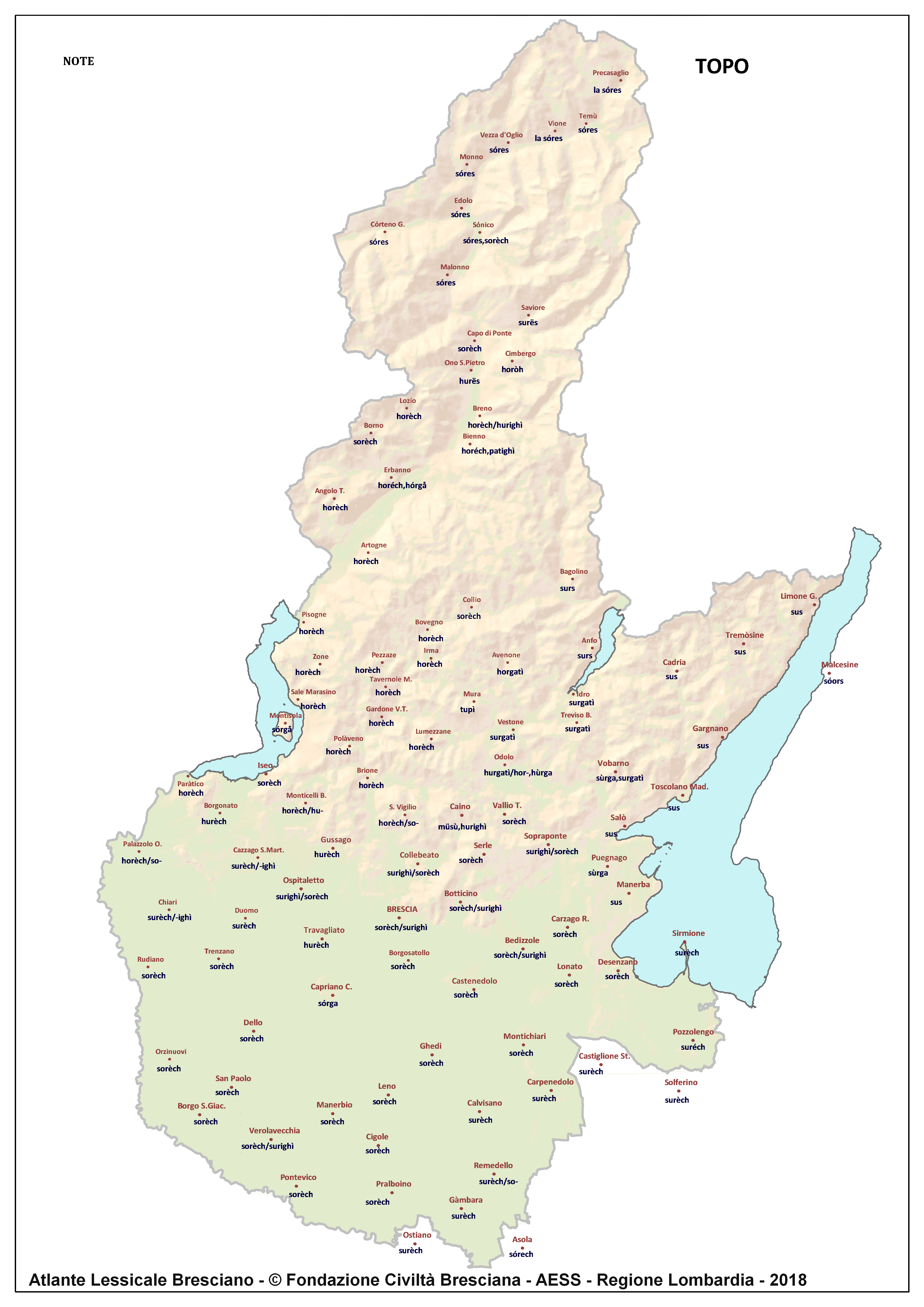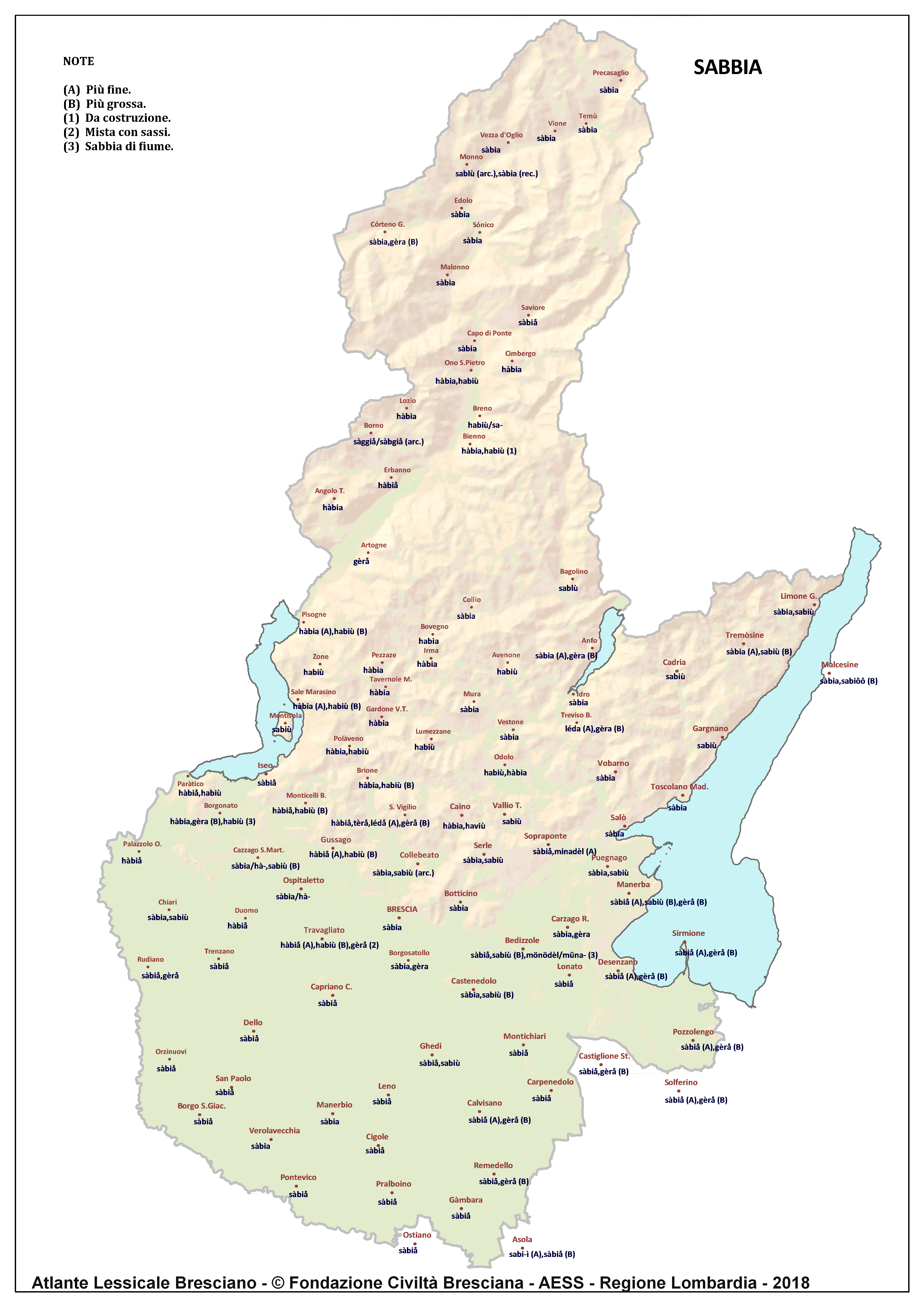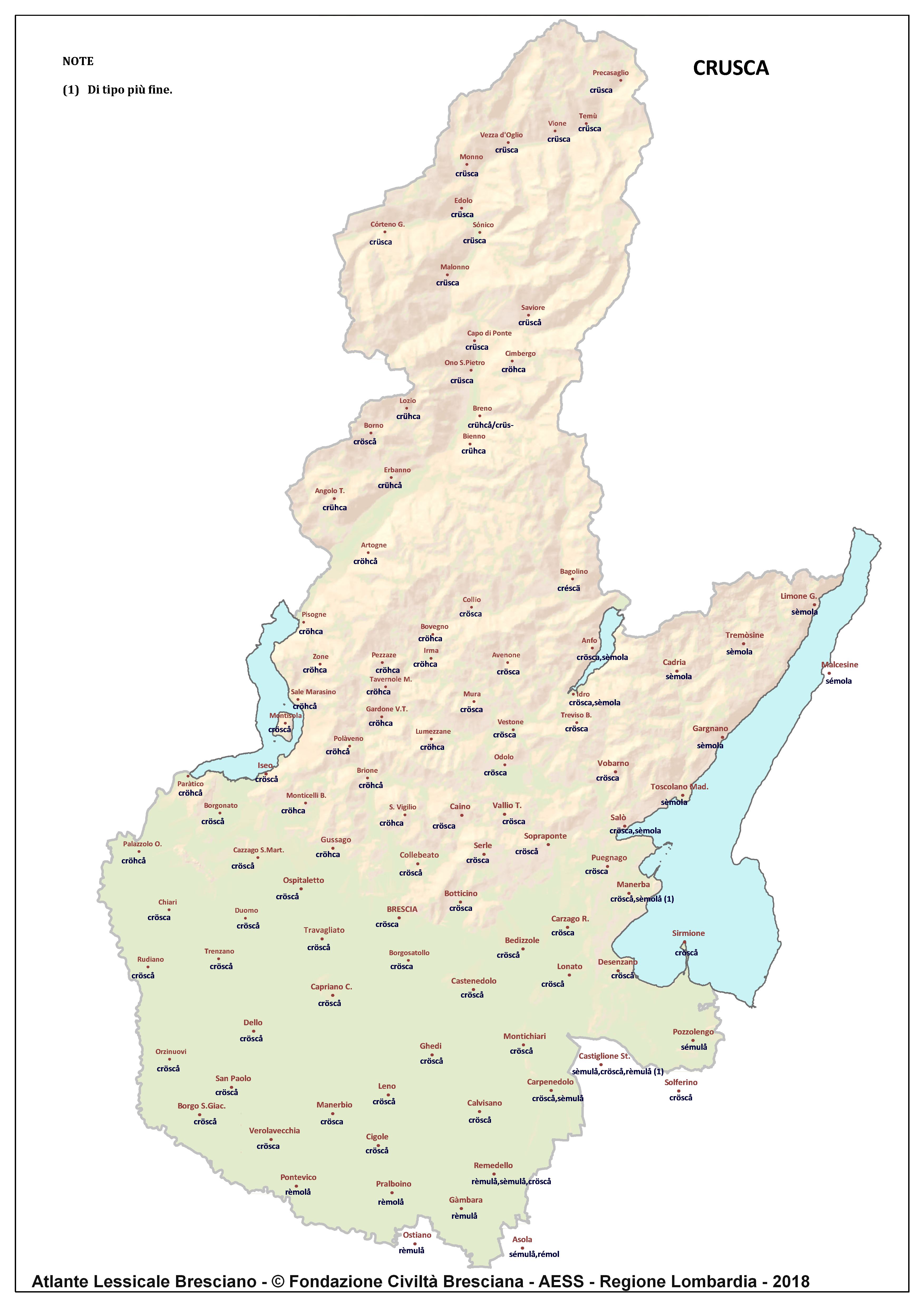 In questa direzione si muove l’Atlante Lessicale Bresciano, che la Fondazione Civiltà Bresciana sta completando sotto la direzione del prof. Giovanni Bonfadini. Presentazione dell’opera. Il dialetto bresciano è parlato in un ampio territorio, fortemente differenziato sia dal punto di vista geografico che da quello socio-economico, con appendici anche al di fuori dei limiti amministrativi provinciali. Sostanzialmente bresciano è infatti il dialetto dell’Alto Mantovano, così come affini al bresciano sono alcuni dialetti delle confinanti valli trentine e della sponda gardesana orientale. In definitiva, possiamo dire che si parlano dialetti di tipo bresciano in quelle aree che, nel lungo lasso di tempo che va dagli albori degli idiomi neolatini fino all’epoca contemporanea, si sono rivolte a Brescia come principale (se non esclusivo) centro di riferimento economico e culturale, anche se non sempre (e in taluni casi mai) sono state sotto la sua giurisdizione amministrativa. In un territorio così vasto le differenze linguistiche, nonostante l’indubbia azione livellatrice del modello cittadino, sono ancora abbastanza evidenti e ciò vale non solo per le zone più periferiche (come l’Alta Val Camonica o l’Alto Garda), ma anche per aree più prossime alla città, specialmente se non dislocate lungo le principali vie di comunicazione (tipico, in questo senso, il caso della Val Gobbia). All’interno dei non molti studi sul bresciano, la variazione geografica del dialetto è stata presa in considerazione in tempi recenti e perlopiù dal punto di vista fonetico e morfologico. Si vedano, a questo proposito, i due saggi di G. Bonfadini Il dialetto bresciano: modello cittadino e varietà periferiche (in ‘Rivista Italiana di dialettologia’, 14, 1990) e Il dialetto bresciano alla luce delle ricerche più recenti (in ‘Annali di storia bresciana’,3, 2015). Poco invece è stato fatto finora per il lessico, che, sulla base dei vocabolari dialettali storici, fornisce un’immagine di unitarietà dovuta unicamente al fatto che tali opere sono state in genere compilate facendo riferimento quasi esclusivamente alla parlata del capoluogo e soltanto da pochissimi anni questa tendenza è stata interrotta grazie al corposo Lessico bresciano di Gianni Pasquini (Roccafranca, 2014) che non a caso ha come sottotitolo I diversi significati, le varie sfumature, le pronunce altre e le scritture di una lingua che ha connotato una civiltà. Sulla scorta dei dati ricavabili dalle inchieste degli atlanti linguistici nazionali – l’Atlante Italo-svizzero (AIS) e l’Atlante Linguistico Italiano (ALI) -, che negli anni Venti e Trenta del secolo scorso hanno interessato il territorio bresciano per una ventina di località, si può invece osservare una grande ricchezza di tipi lessicali diversi per numerosi termini, in particolare (ma non solo) nei settori della flora, della fauna, dei mestieri tradizionali e della vita quotidiana. L’Atlante Lessicale Bresciano si propone di iniziare a colmare questa lacuna attraverso un’indagine a maglie abbastanza strette, che copre con 101 punti di rilevazione circa la metà dei comuni della Provincia di Brescia, sconfinando in cinque casi oltre i limiti amministrativi, e precisamente a Malcésine (VR), Ostiano (CR), Solferino, Castiglione delle Stiviere e Asola (MN). A tal fine il territorio è stato suddiviso in sette aree principali: Brescia e dintorni, Pianura, Garda, Valle Sabbia, Valle Trompia, Franciacorta e Sebino, Valle Camonica, ciascuna delle quali a sua volta ripartita in subaree di dimensioni più limitate. Le inchieste sono state condotte sulla base di un Questionario di 305 voci scelte tra quelle che, da un attento spoglio di tutto il materiale disponibile, mostravano la presenza in area bresciana di almeno due tipi lessicali diversi. Accanto agli obiettivi scientifici, il progetto intende perseguire anche un obiettivo culturale di carattere più generale: contribuire alla documentazione e alla conservazione di un patrimonio linguistico essenziale per la memoria storica delle comunità locali, oggi in continuo depauperamento sotto la spinta della progressiva italianizzazione dei dialetti e dell’abbandono nell’uso concreto di interi settori del lessico strettamente connessi con attività ormai (quasi) completamente scomparse, o radicalmente mutate sul piano dei metodi e delle relative tecnologie. La scelta della forma cartografica per la rappresentazione dei dati raccolti, oltre alla garanzia di una metodologia collaudata in più di un secolo di tradizione scientifica, risponde anche all’opportunità di rendere più semplice la fruizione dei risultati agli utenti non specialisti: le differenze e le somiglianze sono di gran lunga più immediate leggendole su una carta che non in un testo descrittivo. Alcuni dati quantitativi. Per ogni punto di rilevazione sono state condotte, in linea di massima, due inchieste con informatori diversi, in parte direttamente dai membri della Redazione scientifica dell’Atlante che ha operato negli anni della raccolta e della catalogazione del materiale (oltre al Direttore della ricerca, Elisa Noli, Gianfranco Pavia, Giovanni Pontoglio e Piervittorio Rossi), ma per la maggior parte da raccoglitori scelti fra ricercatori ed operatori culturali locali (molti gli insegnanti) e anche da volontari disponibili a raccogliere i dati seguendo il modello elaborato dalla Redazione. Questa attività, condotta spesso con grande entusiasmo e consapevolezza degli obiettivi del progetto, ha interessato nel complesso circa 60 raccoglitori e non meno di 250 informatori. Il lavoro di spoglio e schedatura del materiale raccolto in sette anni dal 1994 al 2000, tenuto conto del numero delle voci del questionario, del numero delle inchieste svolte e dei numerosi casi di risposte multiple, ha comportato l’esame di circa 70.000 forme dialettali. L’edizione dell’Atlante. In attesa del completamento dei lavori redazionali, l’Atla