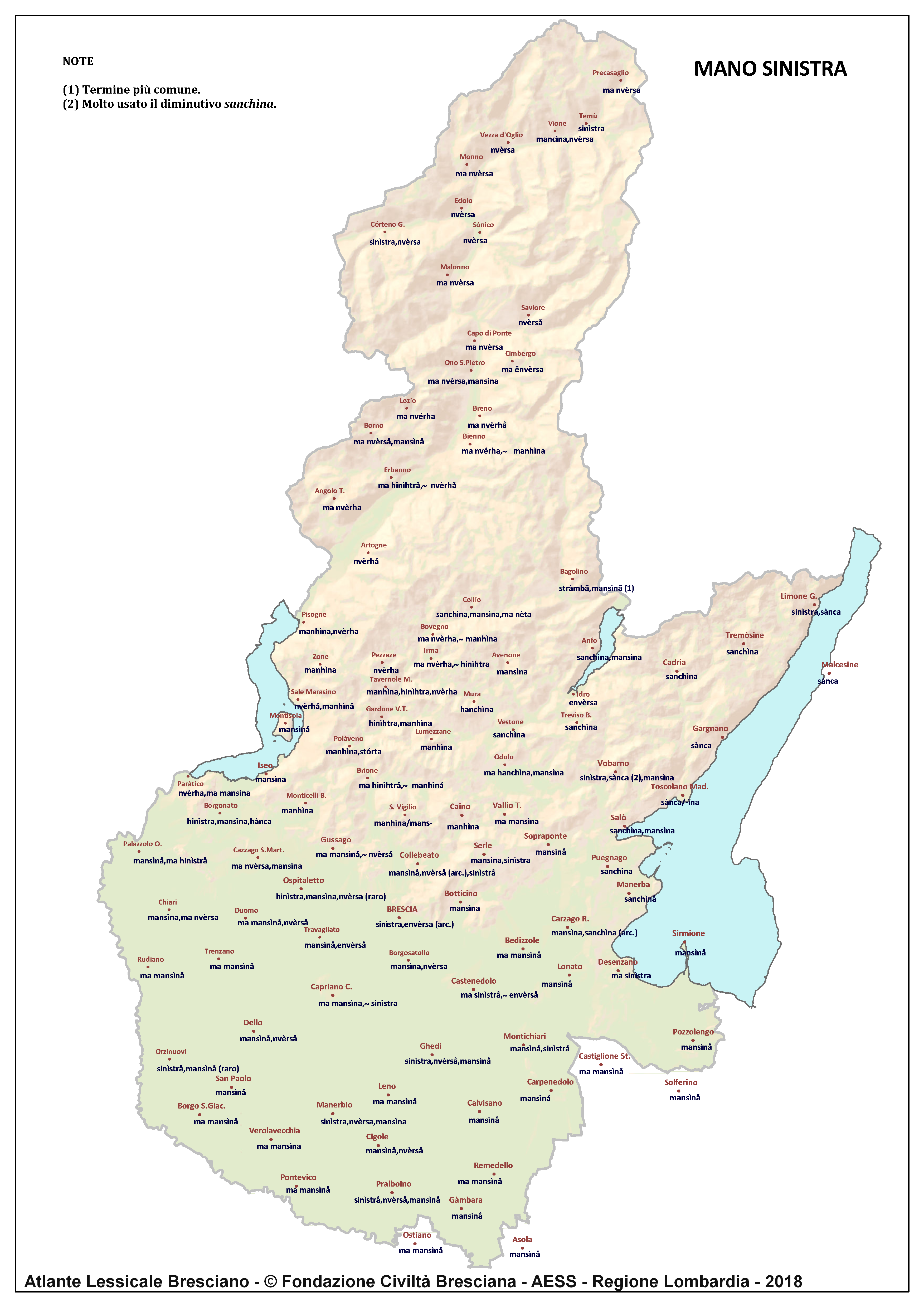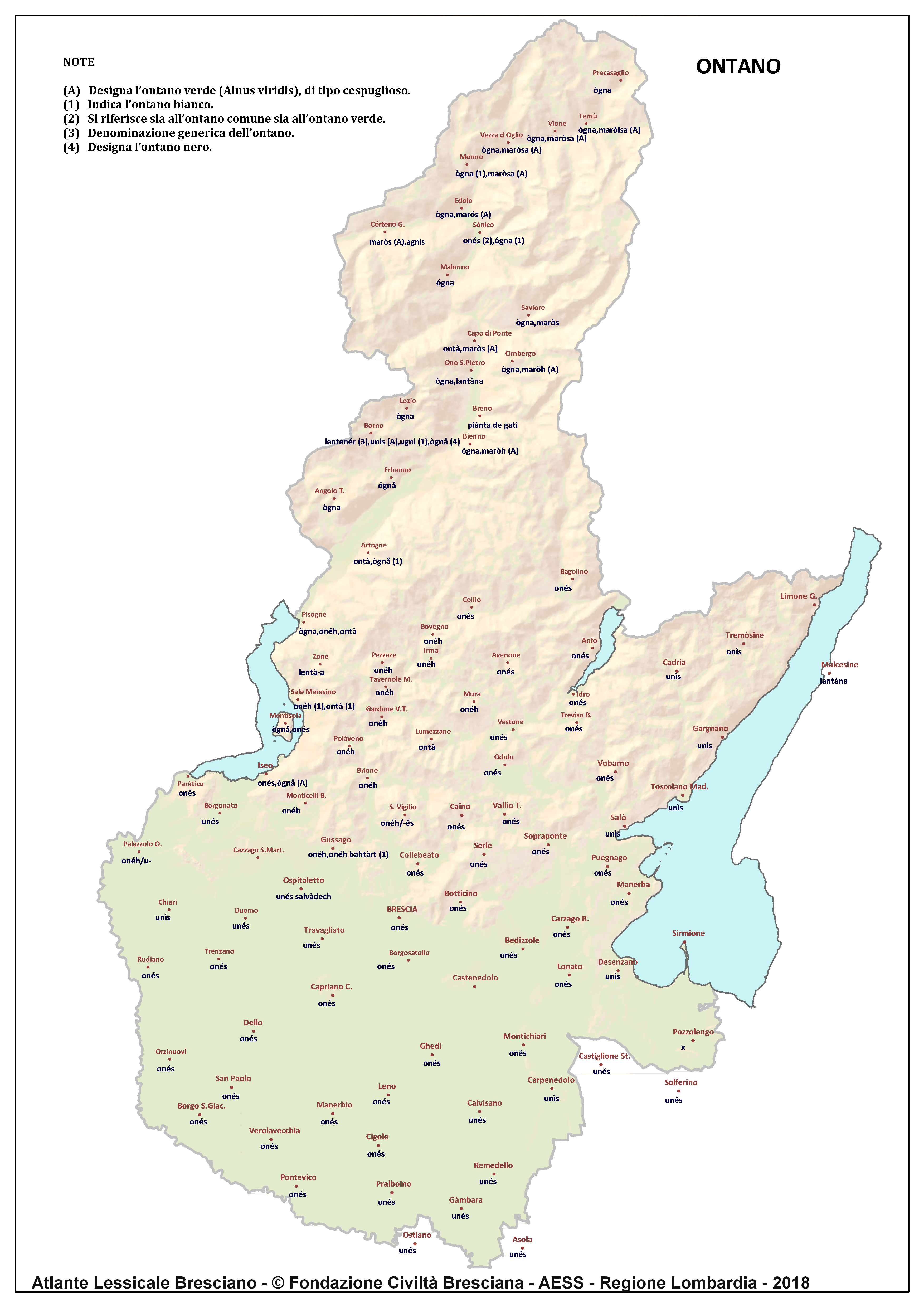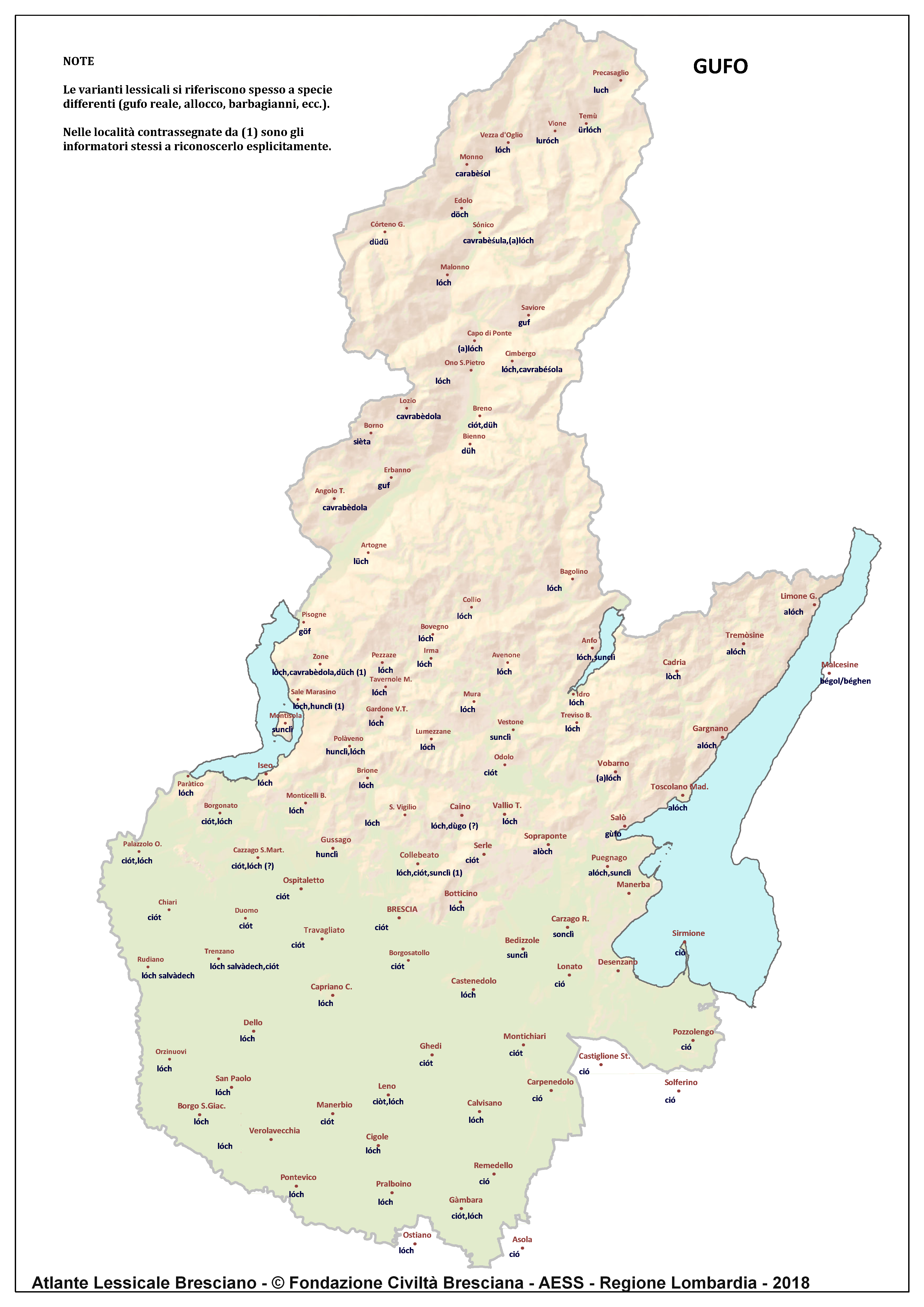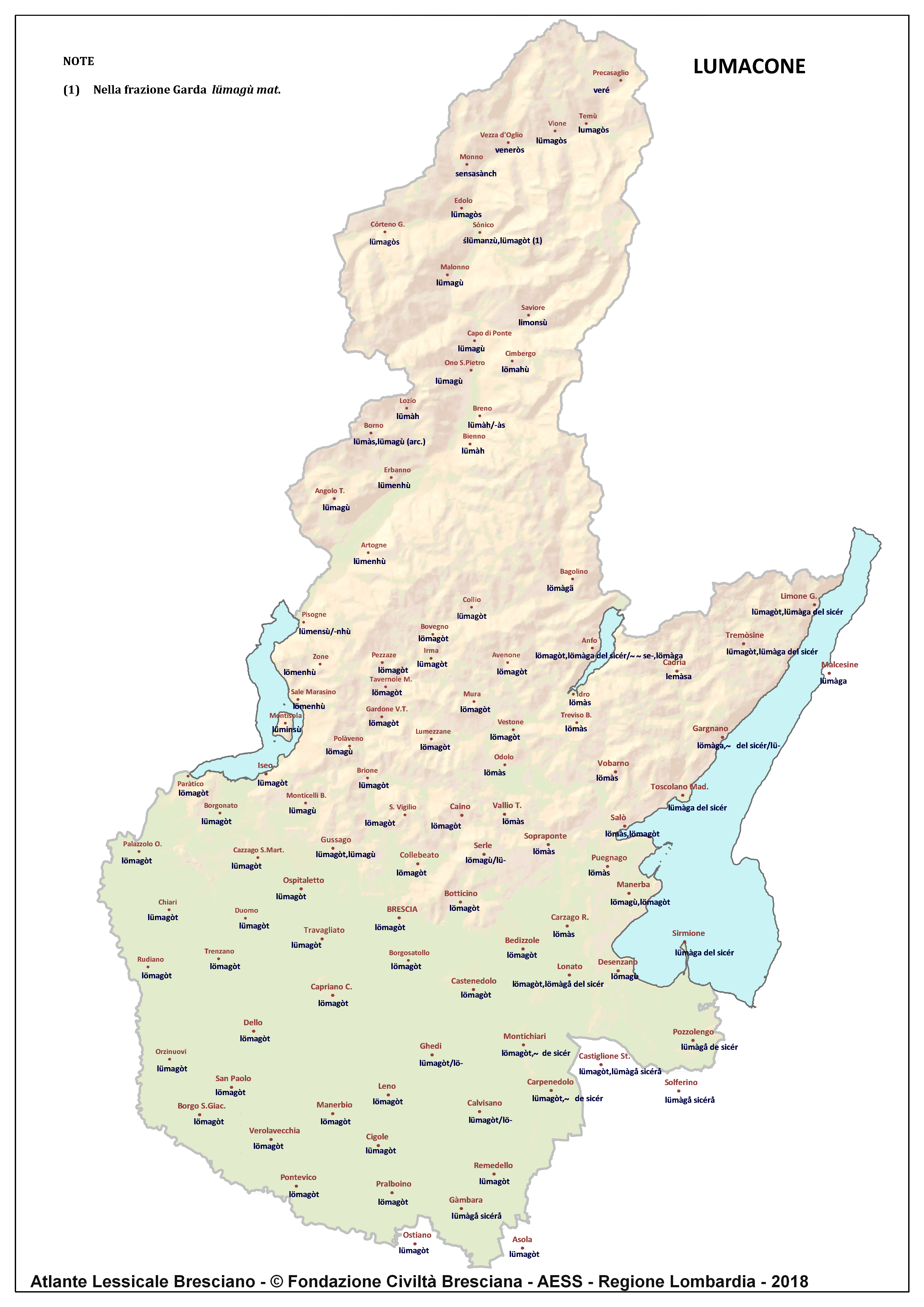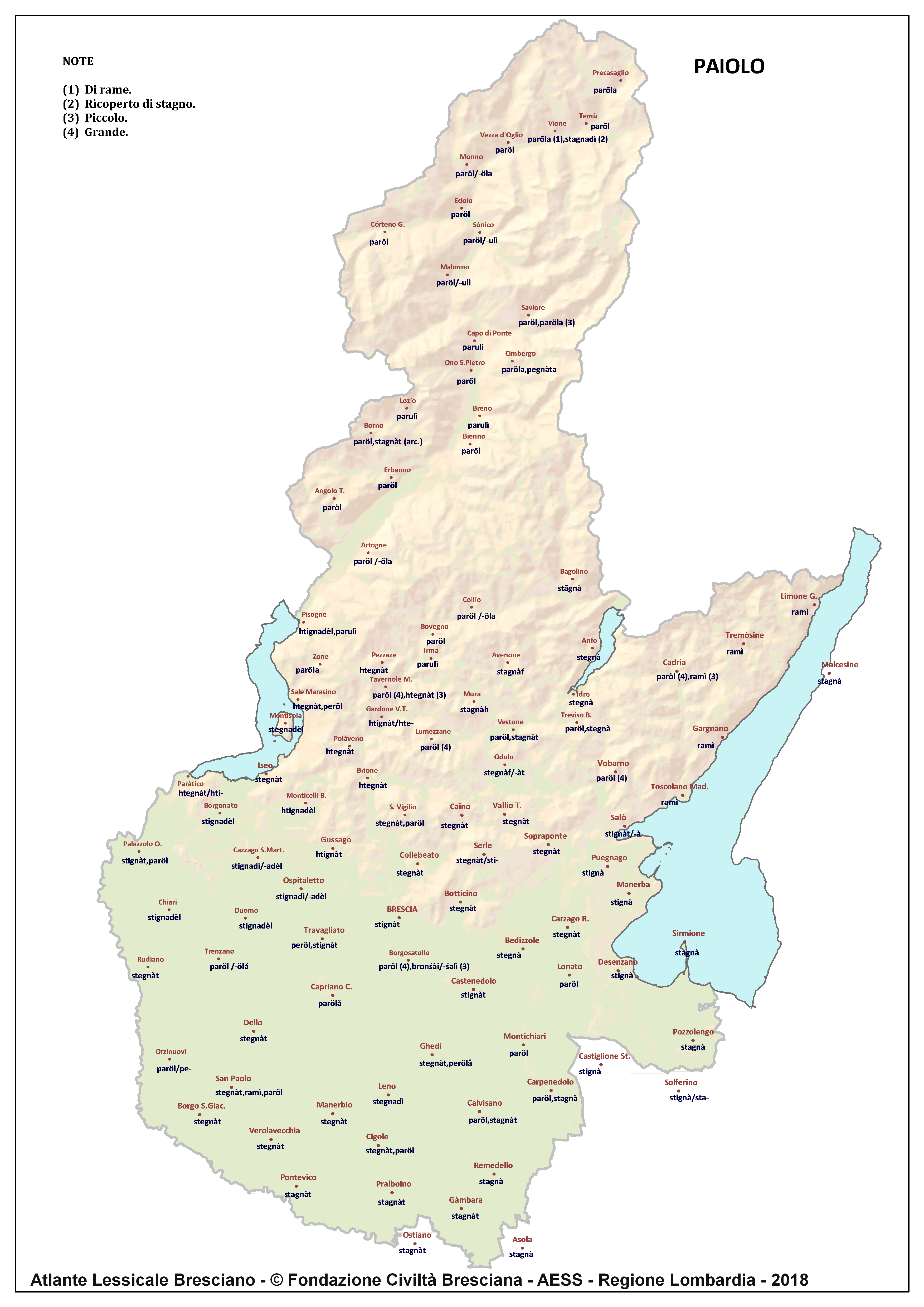 In questa direzione si muove l’Atlante Lessicale Bresciano, che la Fondazione Civiltà Bresciana sta completando sotto la direzione del prof. Giovanni Bonfadini. Presentazione dell’opera. Il dialetto bresciano è parlato in un ampio territorio, fortemente differenziato sia dal punto di vista geografico che da quello socio-economico, con appendici anche al di fuori dei limiti amministrativi provinciali. Sostanzialmente bresciano è infatti il dialetto dell’Alto Mantovano, così come affini al bresciano sono alcuni dialetti delle confinanti valli trentine e della sponda gardesana orientale. In definitiva, possiamo dire che si parlano dialetti di tipo bresciano in quelle aree che, nel lungo lasso di tempo che va dagli albori degli idiomi neolatini fino all’epoca contemporanea, si sono rivolte a Brescia come principale (se non esclusivo) centro di riferimento economico e culturale, anche se non sempre (e in taluni casi mai) sono state sotto la sua giurisdizione amministrativa. In un territorio così vasto le differenze linguistiche, nonostante l’indubbia azione livellatrice del modello cittadino, sono ancora abbastanza evidenti e ciò vale non solo per le zone più periferiche (come l’Alta Val Camonica o l’Alto Garda), ma anche per aree più prossime alla città, specialmente se non dislocate lungo le principali vie di comunicazione (tipico, in questo senso, il caso della Val Gobbia). All’interno dei non molti studi sul bresciano, la variazione geografica del dialetto è stata presa in considerazione in tempi recenti e perlopiù dal punto di vista fonetico e morfologico. Si vedano, a questo proposito, i due saggi di G. Bonfadini Il dialetto bresciano: modello cittadino e varietà periferiche (in ‘Rivista Italiana di dialettologia’, 14, 1990) e Il dialetto bresciano alla luce delle ricerche più recenti (in ‘Annali di storia bresciana’,3, 2015). Poco invece è stato fatto finora per il lessico, che, sulla base dei vocabolari dialettali storici, fornisce un’immagine di unitarietà dovuta unicamente al fatto che tali opere sono state in genere compilate facendo riferimento quasi esclusivamente alla parlata del capoluogo e soltanto da pochissimi anni questa tendenza è stata interrotta grazie al corposo Lessico bresciano di Gianni Pasquini (Roccafranca, 2014) che non a caso ha come sottotitolo I diversi significati, le varie sfumature, le pronunce altre e le scritture di una lingua che ha connotato una civiltà. Sulla scorta dei dati ricavabili dalle inchieste degli atlanti linguistici nazionali – l’Atlante Italo-svizzero (AIS) e l’Atlante Linguistico Italiano (ALI) -, che negli anni Venti e Trenta del secolo scorso hanno interessato il territorio bresciano per una ventina di località, si può invece osservare una grande ricchezza di tipi lessicali diversi per numerosi termini, in particolare (ma non solo) nei settori della flora, della fauna, dei mestieri tradizionali e della vita quotidiana. L’Atlante Lessicale Bresciano si propone di iniziare a colmare questa lacuna attraverso un’indagine a maglie abbastanza strette, che copre con 101 punti di rilevazione circa la metà dei comuni della Provincia di Brescia, sconfinando in cinque casi oltre i limiti amministrativi, e precisamente a Malcésine (VR), Ostiano (CR), Solferino, Castiglione delle Stiviere e Asola (MN). A tal fine il territorio è stato suddiviso in sette aree principali: Brescia e dintorni, Pianura, Garda, Valle Sabbia, Valle Trompia, Franciacorta e Sebino, Valle Camonica, ciascuna delle quali a sua volta ripartita in subaree di dimensioni più limitate. Le inchieste sono state condotte sulla base di un Questionario di 305 voci scelte tra quelle che, da un attento spoglio di tutto il materiale disponibile, mostravano la presenza in area bresciana di almeno due tipi lessicali diversi. Accanto agli obiettivi scientifici, il progetto intende perseguire anche un obiettivo culturale di carattere più generale: contribuire alla documentazione e alla conservazione di un patrimonio linguistico essenziale per la memoria storica delle comunità locali, oggi in continuo depauperamento sotto la spinta della progressiva italianizzazione dei dialetti e dell’abbandono nell’uso concreto di interi settori del lessico strettamente connessi con attività ormai (quasi) completamente scomparse, o radicalmente mutate sul piano dei metodi e delle relative tecnologie. La scelta della forma cartografica per la rappresentazione dei dati raccolti, oltre alla garanzia di una metodologia collaudata in più di un secolo di tradizione scientifica, risponde anche all’opportunità di rendere più semplice la fruizione dei risultati agli utenti non specialisti: le differenze e le somiglianze sono di gran lunga più immediate leggendole su una carta che non in un testo descrittivo. Alcuni dati quantitativi. Per ogni punto di rilevazione sono state condotte, in linea di massima, due inchieste con informatori diversi, in parte direttamente dai membri della Redazione scientifica dell’Atlante che ha operato negli anni della raccolta e della catalogazione del materiale (oltre al Direttore della ricerca, Elisa Noli, Gianfranco Pavia, Giovanni Pontoglio e Piervittorio Rossi), ma per la maggior parte da raccoglitori scelti fra ricercatori ed operatori culturali locali (molti gli insegnanti) e anche da volontari disponibili a raccogliere i dati seguendo il modello elaborato dalla Redazione. Questa attività, condotta spesso con grande entusiasmo e consapevolezza degli obiettivi del progetto, ha interessato nel complesso circa 60 raccoglitori e non meno di 250 informatori. Il lavoro di spoglio e schedatura del materiale raccolto in sette anni dal 1994 al 2000, tenuto conto del numero delle voci del questionario, del numero delle inchieste svolte e dei numerosi casi di risposte multiple, ha comportato l’esame di circa 70.000 forme dialettali. L’edizione dell’Atlante. In attesa del completamento dei lavori redazionali, l’Atla