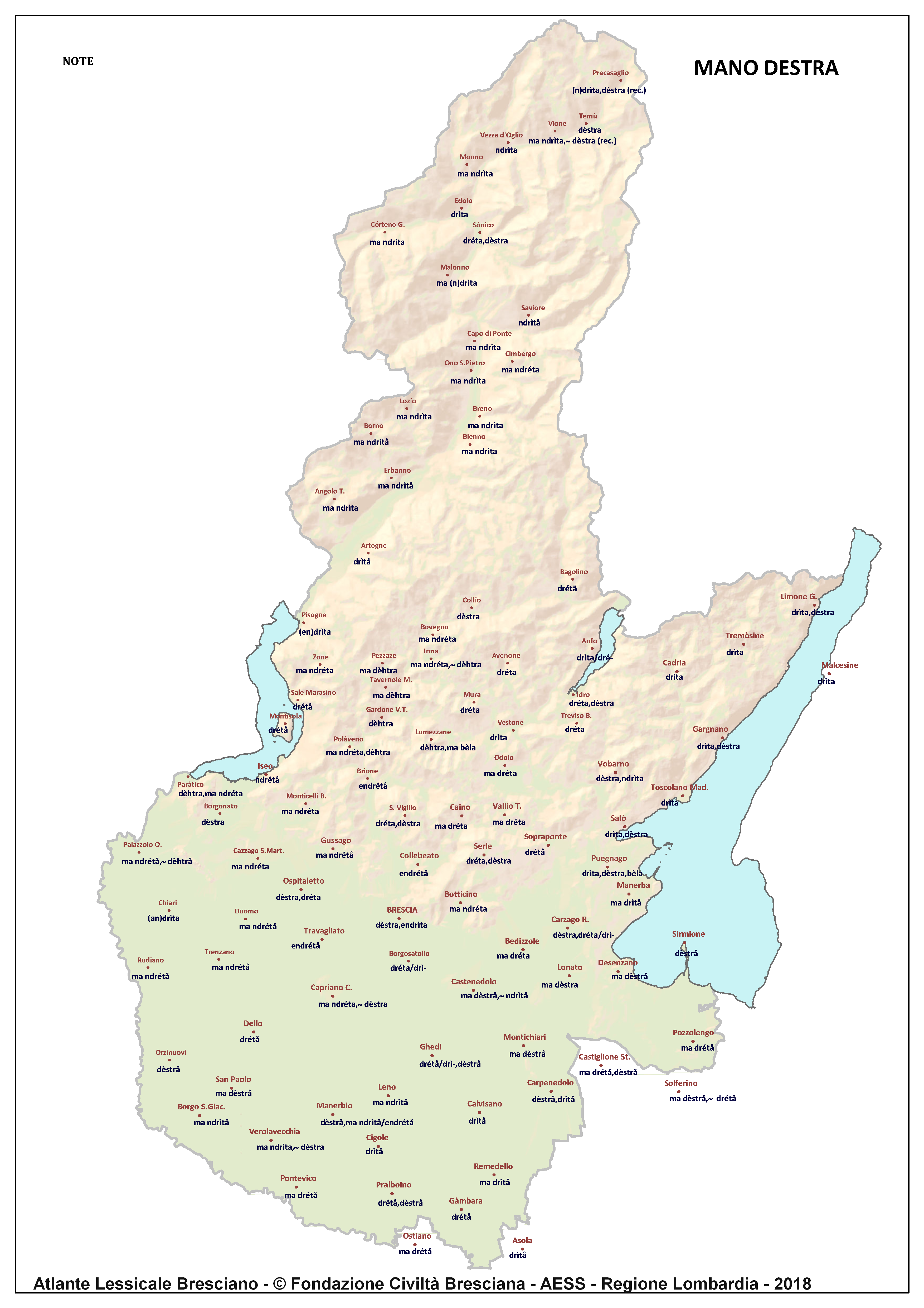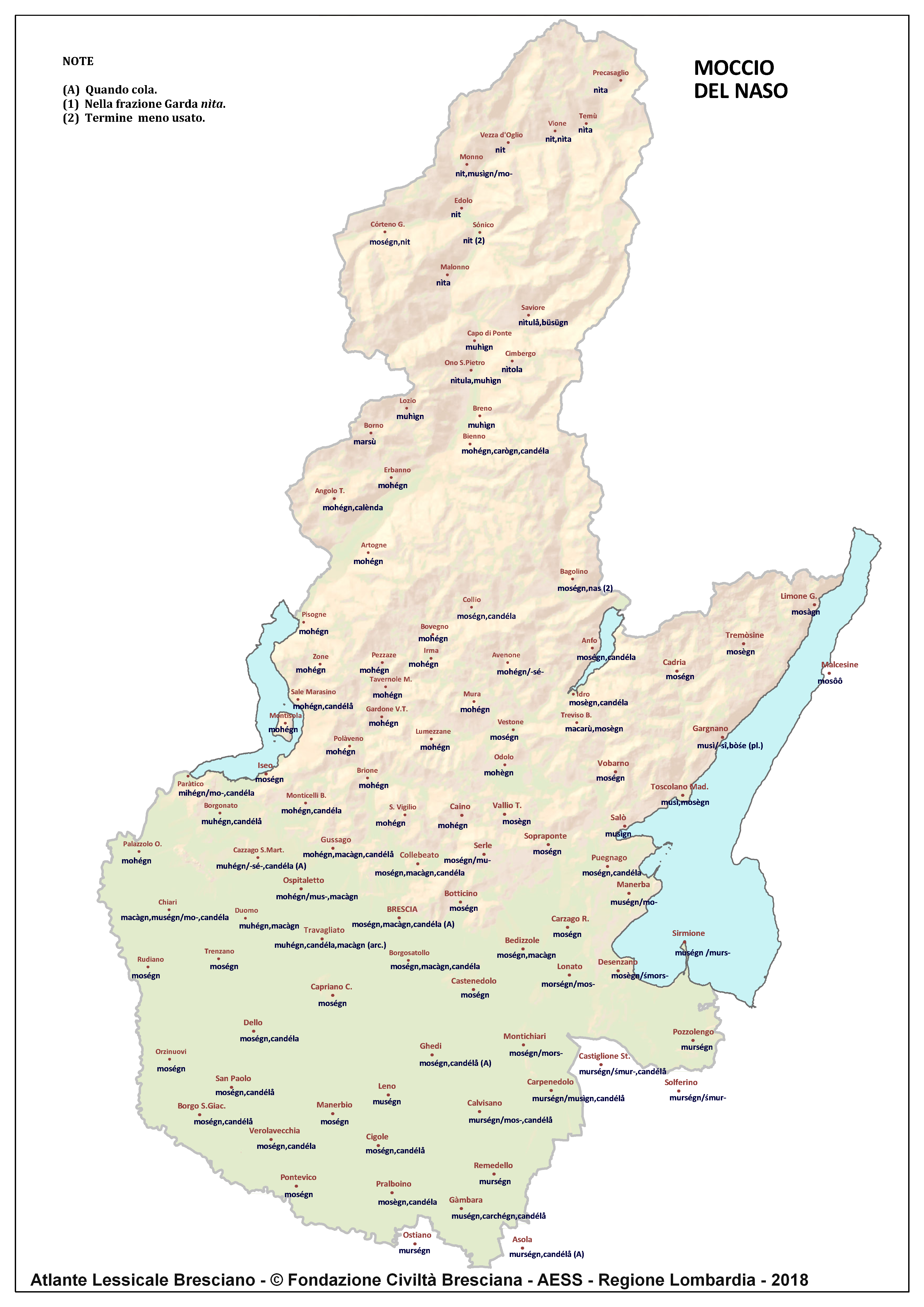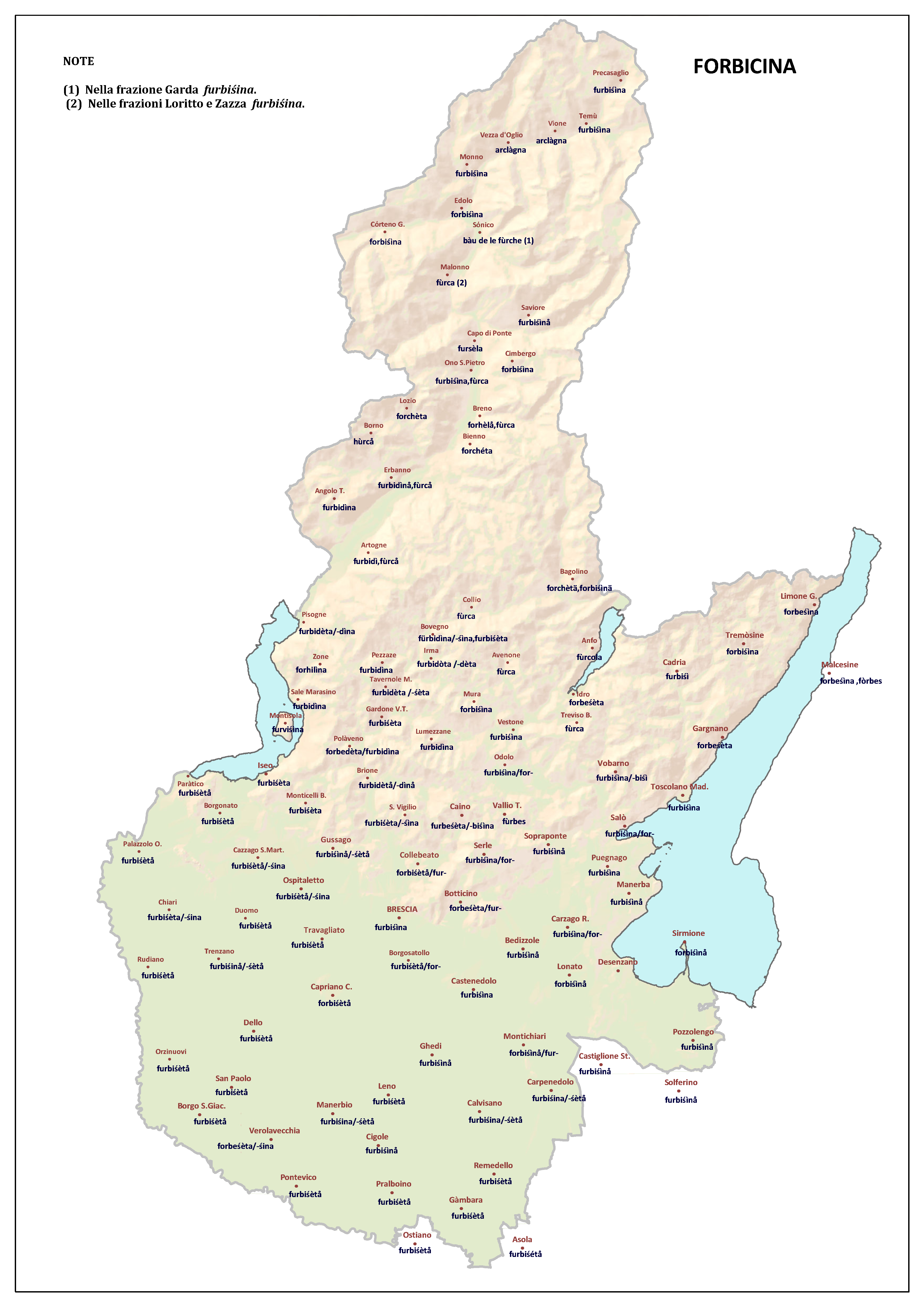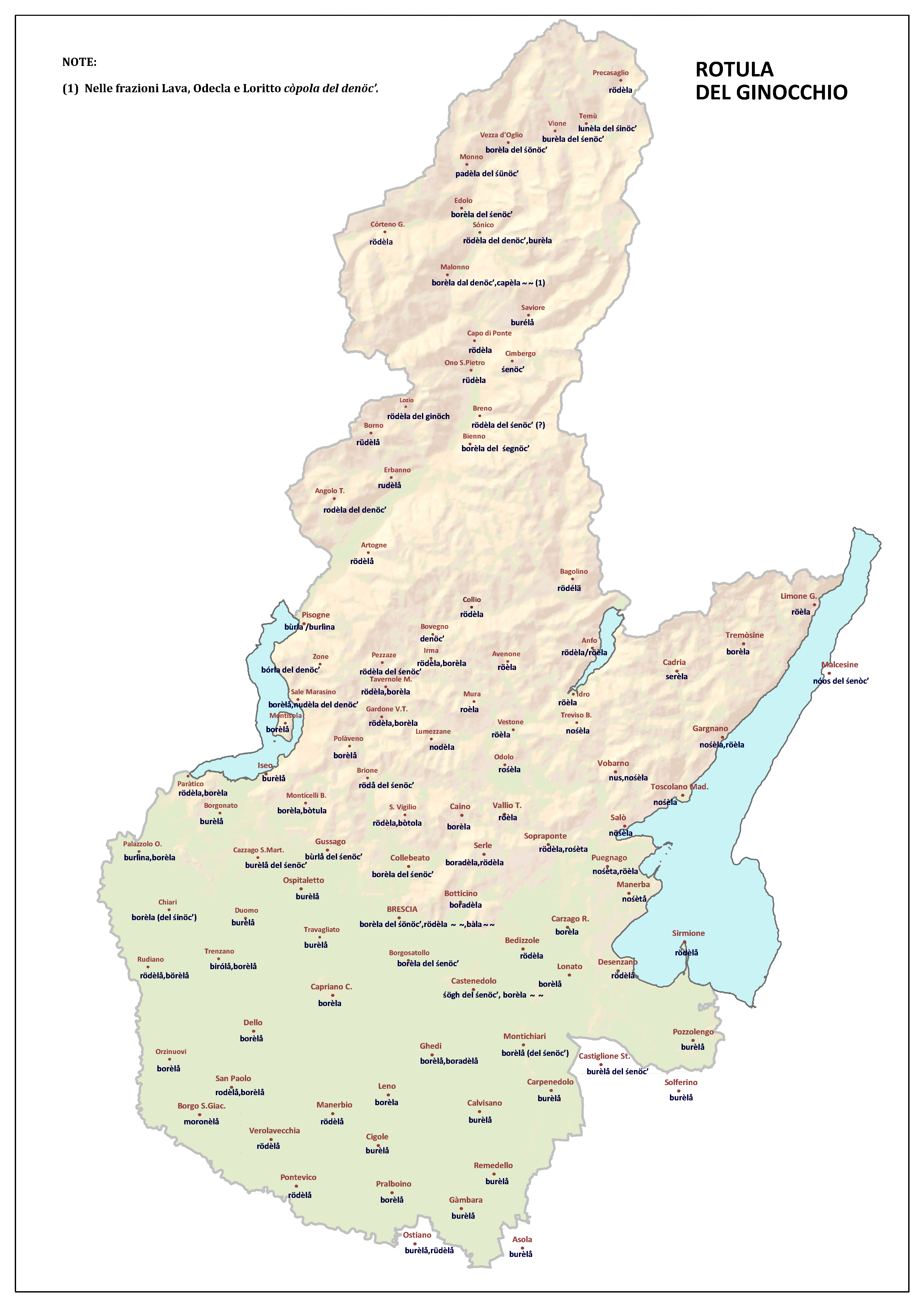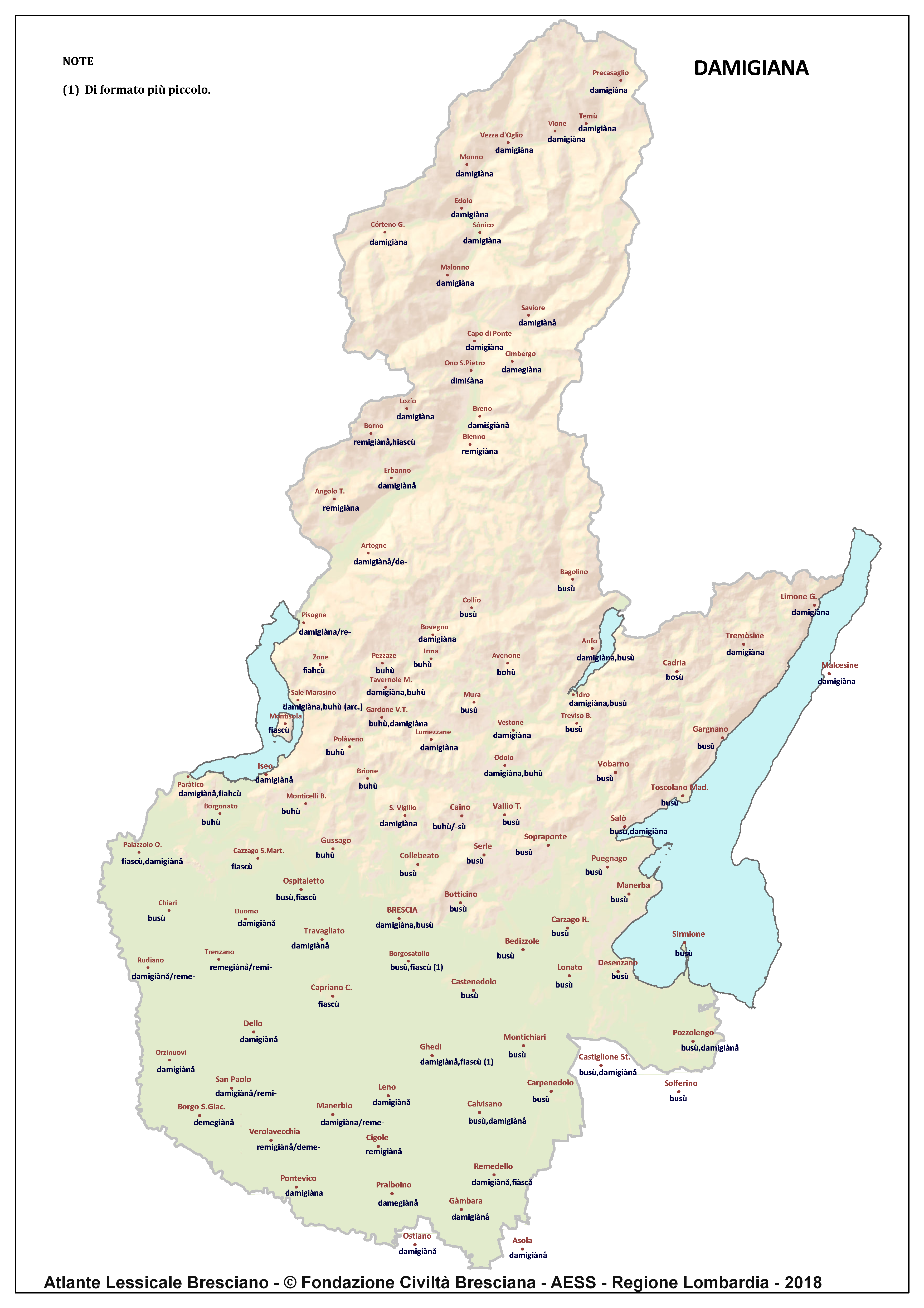 In questa direzione si muove l’Atlante Lessicale Bresciano, che la Fondazione Civiltà Bresciana sta completando sotto la direzione del prof. Giovanni Bonfadini. Presentazione dell’opera. Il dialetto bresciano è parlato in un ampio territorio, fortemente differenziato sia dal punto di vista geografico che da quello socio-economico, con appendici anche al di fuori dei limiti amministrativi provinciali. Sostanzialmente bresciano è infatti il dialetto dell’Alto Mantovano, così come affini al bresciano sono alcuni dialetti delle confinanti valli trentine e della sponda gardesana orientale. In definitiva, possiamo dire che si parlano dialetti di tipo bresciano in quelle aree che, nel lungo lasso di tempo che va dagli albori degli idiomi neolatini fino all’epoca contemporanea, si sono rivolte a Brescia come principale (se non esclusivo) centro di riferimento economico e culturale, anche se non sempre (e in taluni casi mai) sono state sotto la sua giurisdizione amministrativa. In un territorio così vasto le differenze linguistiche, nonostante l’indubbia azione livellatrice del modello cittadino, sono ancora abbastanza evidenti e ciò vale non solo per le zone più periferiche (come l’Alta Val Camonica o l’Alto Garda), ma anche per aree più prossime alla città, specialmente se non dislocate lungo le principali vie di comunicazione (tipico, in questo senso, il caso della Val Gobbia). All’interno dei non molti studi sul bresciano, la variazione geografica del dialetto è stata presa in considerazione in tempi recenti e perlopiù dal punto di vista fonetico e morfologico. Si vedano, a questo proposito, i due saggi di G. Bonfadini Il dialetto bresciano: modello cittadino e varietà periferiche (in ‘Rivista Italiana di dialettologia’, 14, 1990) e Il dialetto bresciano alla luce delle ricerche più recenti (in ‘Annali di storia bresciana’,3, 2015). Poco invece è stato fatto finora per il lessico, che, sulla base dei vocabolari dialettali storici, fornisce un’immagine di unitarietà dovuta unicamente al fatto che tali opere sono state in genere compilate facendo riferimento quasi esclusivamente alla parlata del capoluogo e soltanto da pochissimi anni questa tendenza è stata interrotta grazie al corposo Lessico bresciano di Gianni Pasquini (Roccafranca, 2014) che non a caso ha come sottotitolo I diversi significati, le varie sfumature, le pronunce altre e le scritture di una lingua che ha connotato una civiltà. Sulla scorta dei dati ricavabili dalle inchieste degli atlanti linguistici nazionali – l’Atlante Italo-svizzero (AIS) e l’Atlante Linguistico Italiano (ALI) -, che negli anni Venti e Trenta del secolo scorso hanno interessato il territorio bresciano per una ventina di località, si può invece osservare una grande ricchezza di tipi lessicali diversi per numerosi termini, in particolare (ma non solo) nei settori della flora, della fauna, dei mestieri tradizionali e della vita quotidiana. L’Atlante Lessicale Bresciano si propone di iniziare a colmare questa lacuna attraverso un’indagine a maglie abbastanza strette, che copre con 101 punti di rilevazione circa la metà dei comuni della Provincia di Brescia, sconfinando in cinque casi oltre i limiti amministrativi, e precisamente a Malcésine (VR), Ostiano (CR), Solferino, Castiglione delle Stiviere e Asola (MN). A tal fine il territorio è stato suddiviso in sette aree principali: Brescia e dintorni, Pianura, Garda, Valle Sabbia, Valle Trompia, Franciacorta e Sebino, Valle Camonica, ciascuna delle quali a sua volta ripartita in subaree di dimensioni più limitate. Le inchieste sono state condotte sulla base di un Questionario di 305 voci scelte tra quelle che, da un attento spoglio di tutto il materiale disponibile, mostravano la presenza in area bresciana di almeno due tipi lessicali diversi. Accanto agli obiettivi scientifici, il progetto intende perseguire anche un obiettivo culturale di carattere più generale: contribuire alla documentazione e alla conservazione di un patrimonio linguistico essenziale per la memoria storica delle comunità locali, oggi in continuo depauperamento sotto la spinta della progressiva italianizzazione dei dialetti e dell’abbandono nell’uso concreto di interi settori del lessico strettamente connessi con attività ormai (quasi) completamente scomparse, o radicalmente mutate sul piano dei metodi e delle relative tecnologie. La scelta della forma cartografica per la rappresentazione dei dati raccolti, oltre alla garanzia di una metodologia collaudata in più di un secolo di tradizione scientifica, risponde anche all’opportunità di rendere più semplice la fruizione dei risultati agli utenti non specialisti: le differenze e le somiglianze sono di gran lunga più immediate leggendole su una carta che non in un testo descrittivo. Alcuni dati quantitativi. Per ogni punto di rilevazione sono state condotte, in linea di massima, due inchieste con informatori diversi, in parte direttamente dai membri della Redazione scientifica dell’Atlante che ha operato negli anni della raccolta e della catalogazione del materiale (oltre al Direttore della ricerca, Elisa Noli, Gianfranco Pavia, Giovanni Pontoglio e Piervittorio Rossi), ma per la maggior parte da raccoglitori scelti fra ricercatori ed operatori culturali locali (molti gli insegnanti) e anche da volontari disponibili a raccogliere i dati seguendo il modello elaborato dalla Redazione. Questa attività, condotta spesso con grande entusiasmo e consapevolezza degli obiettivi del progetto, ha interessato nel complesso circa 60 raccoglitori e non meno di 250 informatori. Il lavoro di spoglio e schedatura del materiale raccolto in sette anni dal 1994 al 2000, tenuto conto del numero delle voci del questionario, del numero delle inchieste svolte e dei numerosi casi di risposte multiple, ha comportato l’esame di circa 70.000 forme dialettali. L’edizione dell’Atlante. In attesa del completamento dei lavori redazionali, l’Atla