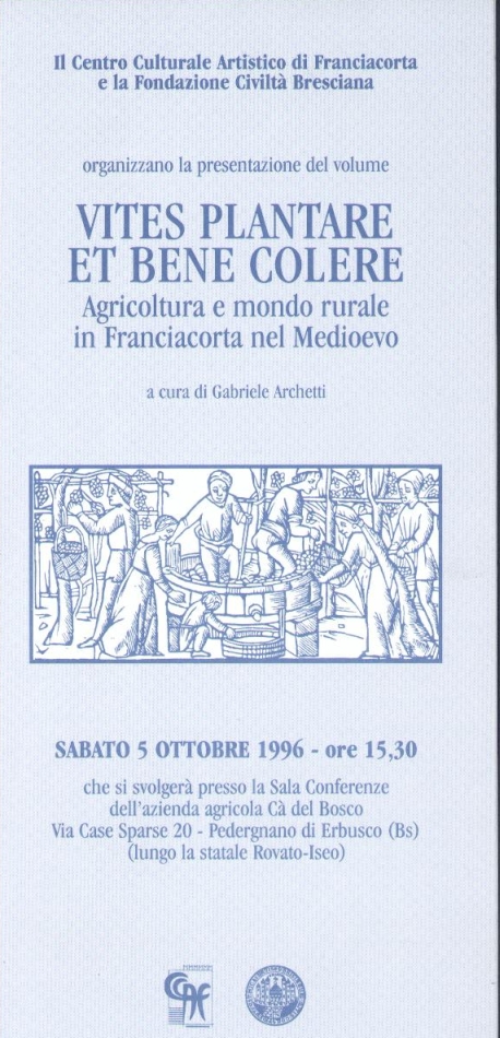 Sabato 5 ottobre 1996 - Sala Conferenze Cà del Bosco, Pedergnano di Erbusco | PRESENTAZIONE VOLUME "VITES PLANTARE ET BENE COLERE. Agricoltura e mondo rurale in Franciacorta nel Medioevo" a cura di GABRIELE ARCHETTI Centro Culturale-artistico di Franciacorta, Fondazione civiltà bresciana INTERVENGONO ANTONIO PINI (Univ. Bologna), CESARE TREBESCHI (Ateneo di Brescia) PRESIEDE PIETRO CONTE (UniCatt di Milano) Dopo la presentazione degustazione vini e visita cantine Cà del Bosco. Invito Abstract |