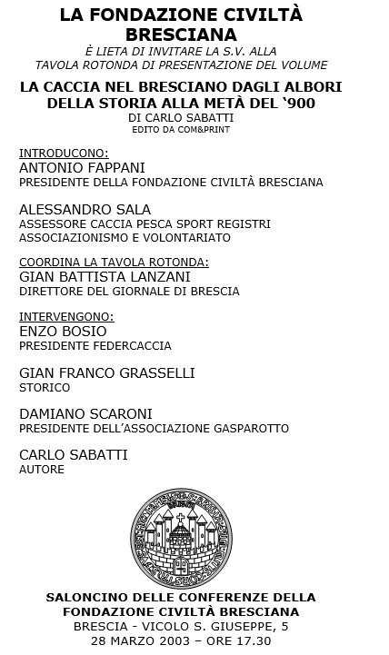 prof. Francesco Barrera. 28 Marzo 2003 - Sede della Fondazione Civiltà Bresciana. Presentazione del volume di Carlo Sabatti:"La Caccia nel bresciano dagli albori della storia alla metà del ‘900” Introduzione di Antonio Fappani, Presidente Fondazione Civiltà Bresciana, Alessandro Sala, assessore caccia,pesca sport registri associazionismo e volontariato. Tavola rotonda: coordina Gian Battista Lanzani, direttore del “Giornale di Brescia”. Interventi di Enzo Bosio, presidente Federcaccia, Gian Franco Grasselli, storico, Damiano Scaroni, presidente dell’associazione Gasparotto, Carlo Sabatti, autore. Invito>> ==========================================