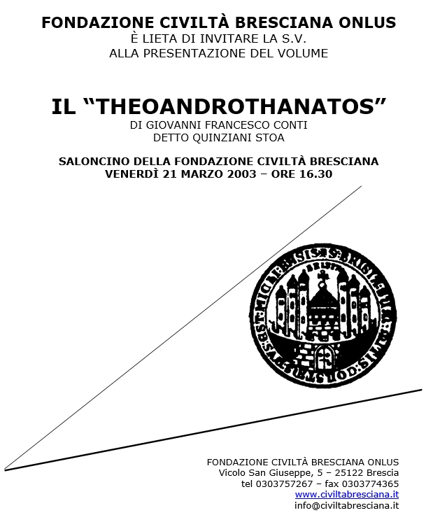 della Famia Bagossa. 21 Marzo 2003 - Sede della Fondazione Civiltà Bresciana. Presentazione del volume: "Il Theoandrothanatos" di Giovanni Francesco Conti detto Quinzani Stoa.< Saluti del Sindaco di Brescia, prof. Paolo Corsini. Coordinamento del dott. Aldo Pirola, direttore della Biblioteca Queriniana. Interventi del prof. Antonio De Prisco-Università di Verona. Presenti le Autrici Gianna Gardenal e Elisabetta Selmi dell’Università di Padova. Invito>> ==========================================
