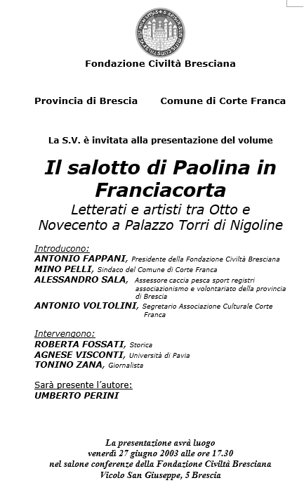 piacere tra le righe” di C. Baresani. Introducono Mons. Fappani e R. Morelli. L'autrice è intervistata da Carla Boroni. 27 giugno 2003 - Fondazione Civiltà Bresciana - Presenrazione del libro di U. Perini; “Il salotto di Paolina in Franciacorta: letterati e artisti fra Otto e Novecento a Palazzo Torri di Nigoline”. Introducono Mons. Fappani; M. Pelli, sindaco del Comune di Cortefranca; A. Sala, assessore Caccia, Pesca, Sport, Registri, associazionismo e volontariato della Provincia di Brescia; A. Voltolini, segretario Associazione culturale Cortefranca. Intervengono R. Fossati, storica, A. Visconti, Università di Pavia, T. Zana, giornalista. Invito>> ==========================================
